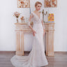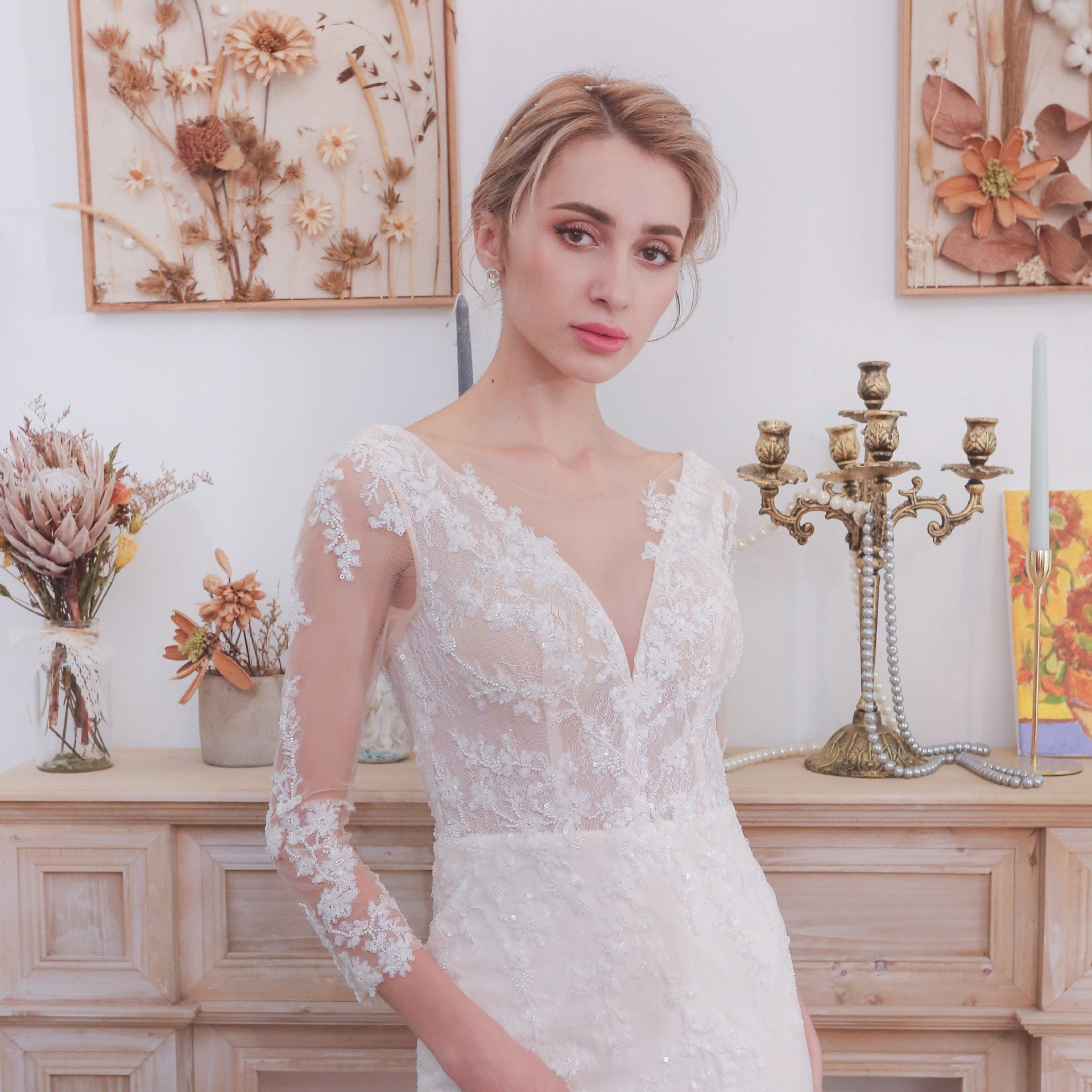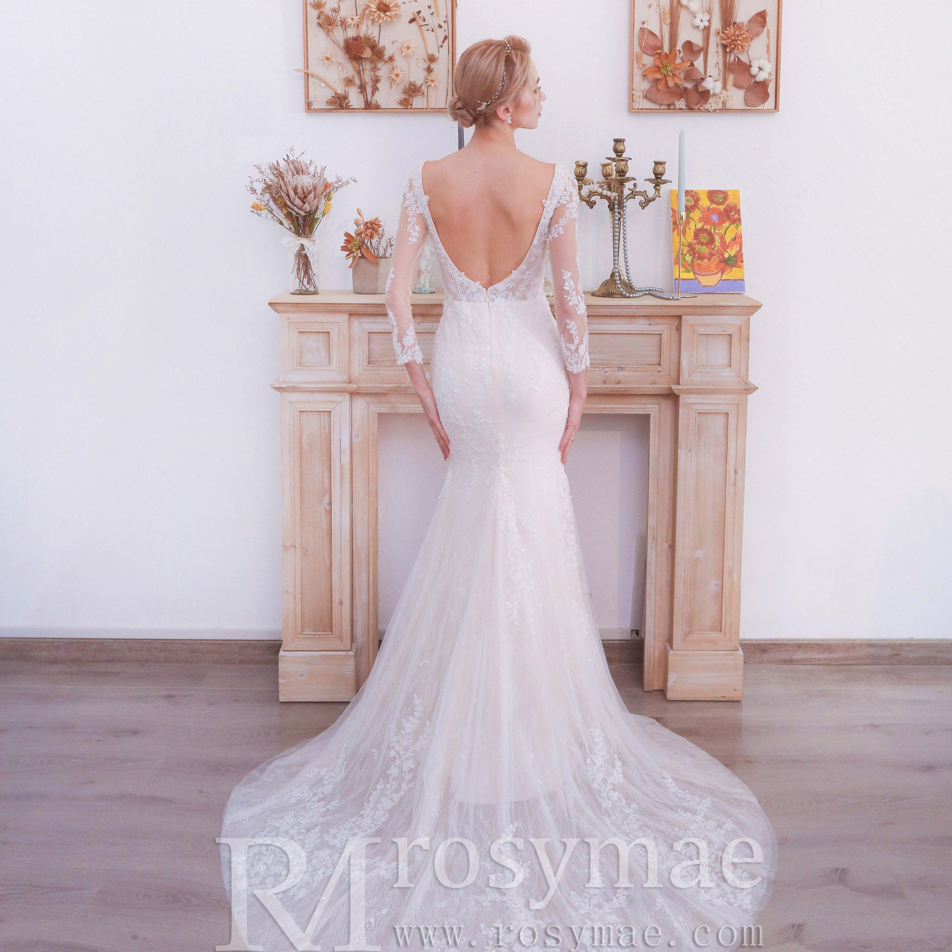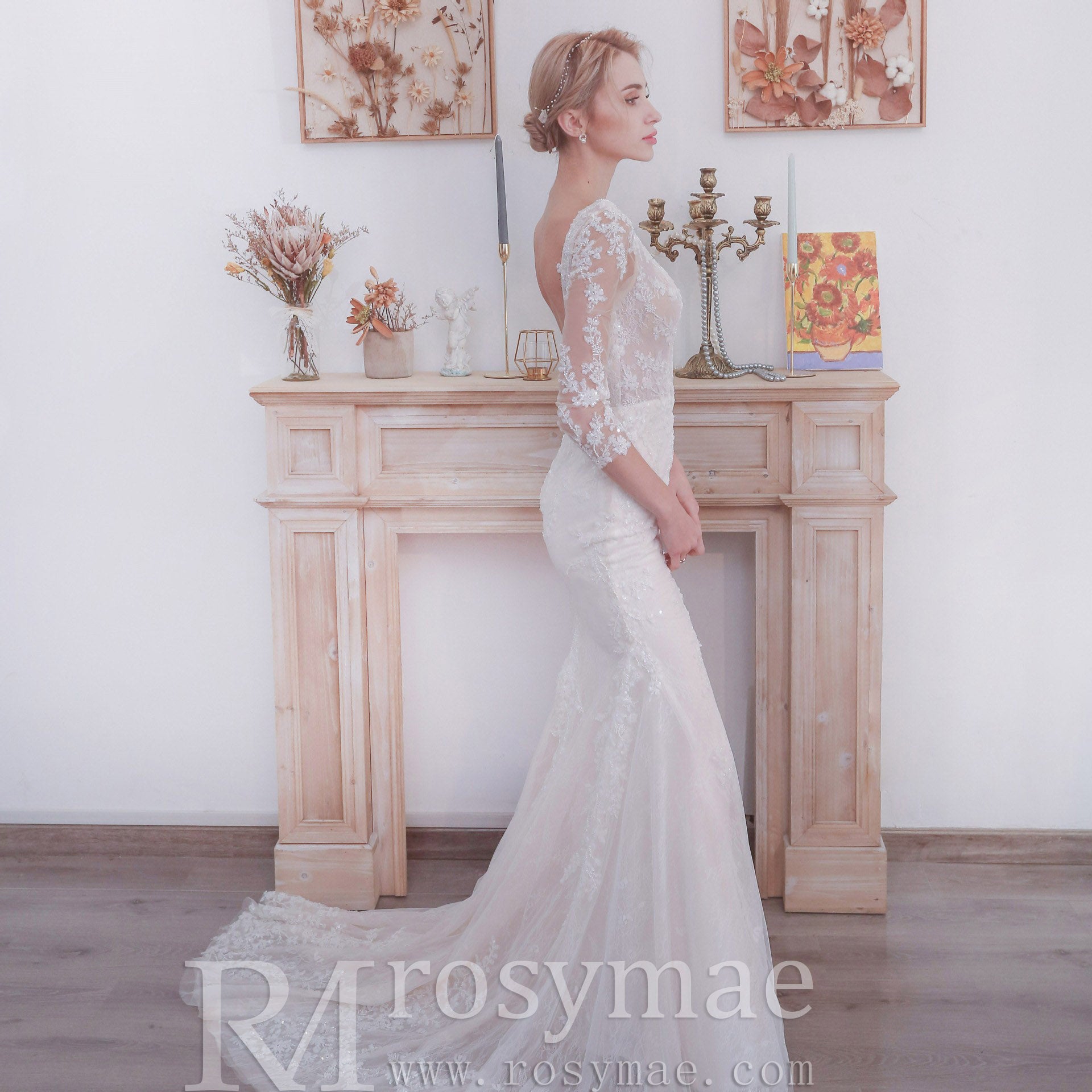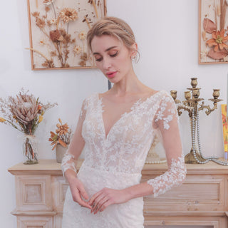 Robe de mariée sirène en dentelle à manches trois quarts plongeant en V profond