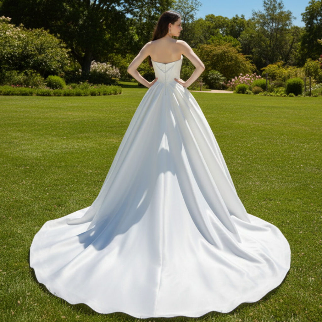 Offrez-vous une élégance discrète avec cette robe de mariée bustier en satin. Avec une encolure bateau et un dos bas sensuel, cette robe est parfaite pour un mariage en plein air. Complétez le look parfait avec un superbe train cathédrale. Faites une déclaration lors de votre journée spéciale avec cette élégante robe de mariée.