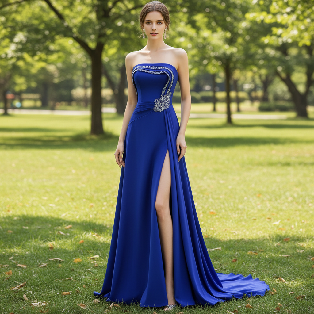 Élevez votre style avec cette robe de bal de luxe trapèze. Cette magnifique robe bustier présente un dos décolleté et un superbe tissu en satin bleu royal. Des perles complexes et des détails faits à la main ajoutent une touche d'élégance et créent une silhouette flatteuse. Avec une fente sur la jambe pour une touche dramatique, cette robe est parfaite pour tout événement spécial.
