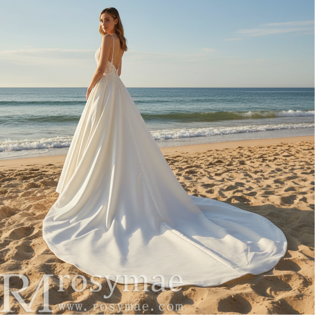 Robe de mariée trapèze classique en satin avec bretelles spaghetti et dos ouvert