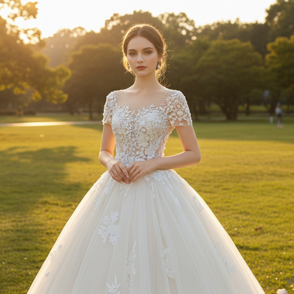 Robe de Mariée Princesse Tulle Dentelle Robe de Mariée avec Manches Courtes