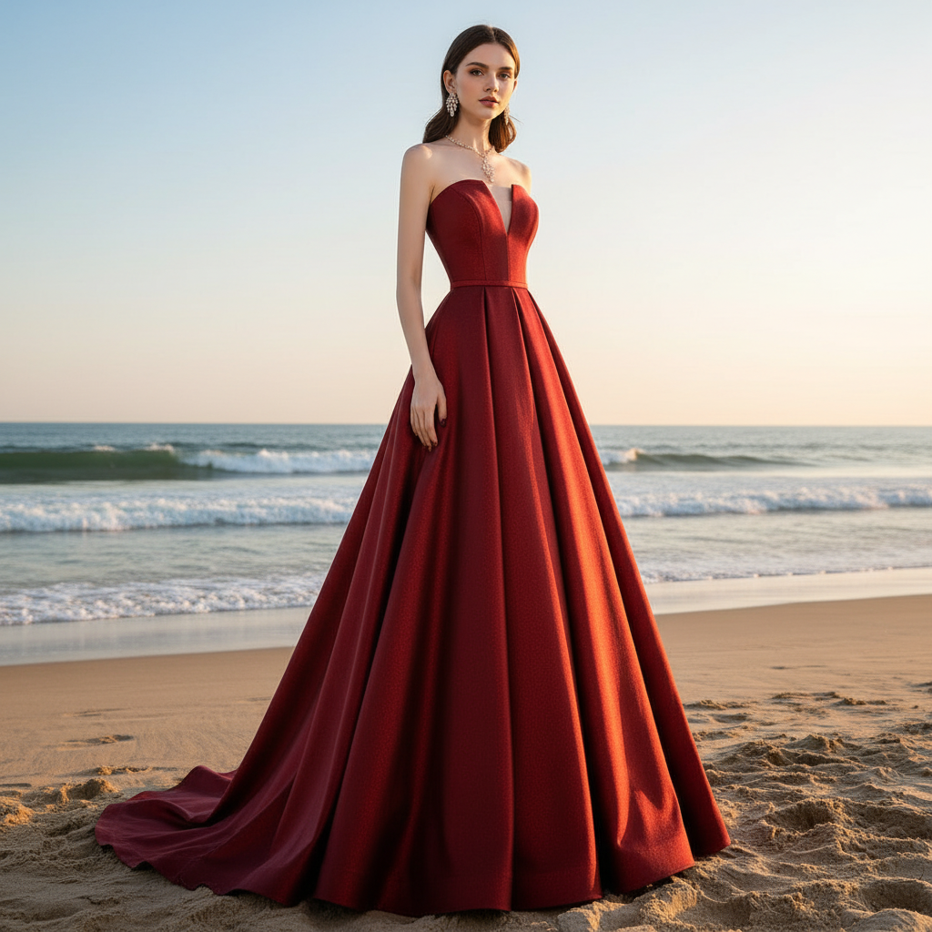 Avec sa silhouette trapèze sophistiquée et son élégant décolleté en V, cette robe de demoiselle d'honneur rouge sans bretelles est parfaite pour toutes vos occasions spéciales. D'une coupe flatteuse à une esthétique raffinée, cette robe respire le luxe et l'exclusivité. Soyez le centre d'attention lors de tous vos événements spéciaux avec cette superbe pièce.