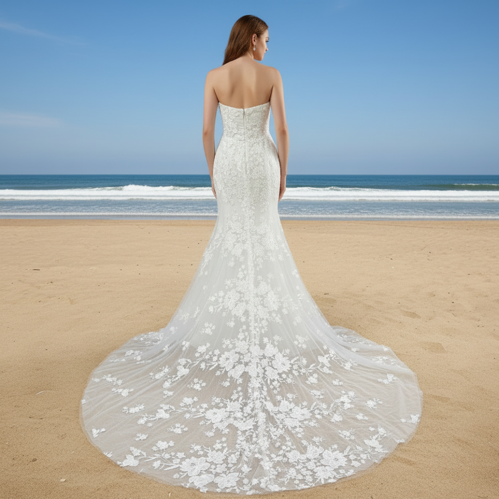 Laissez-vous séduire par l'élégance intemporelle de cette somptueuse robe de mariée sirène, confectionnée avec un savoir-faire exceptionnel et ornée de délicates applications de dentelle florale qui ajoutent une touche de romantisme à votre jour J. Le corsage transparent met en valeur un décolleté en V flatteur, créant une silhouette sophistiquée et charmante qui sublime votre beauté naturelle. Conçue dans des matières légères, cette robe vous assure un confort optimal, que vous remontiez l'allée jusqu'à l'autel dans une chapelle ou que vous célébriez votre union lors d'un mariage à l'étranger. Sa coupe gracieuse épouse vos courbes tout en vous offrant une grande liberté de mouvement, ce qui en fait un choix idéal pour les mariées qui recherchent à la fois style et aisance. Parfaite pour voyager, cette robe allie praticité et élégance, devenant ainsi la compagne idéale de votre voyage de noces. Les détails raffinés de la dentelle et son design intemporel promettent des souvenirs inoubliables, pour une célébration de votre amour placée sous le signe du style et du confort. Que vous échangiez vos vœux près de chez vous ou à l'étranger, cette robe conjugue charme classique et modernité pour une allure de mariée à couper le souffle. Grâce à sa confection délicate et à sa conception polyvalente, cette robe sirène se prête aussi bien aux cérémonies intimes qu'aux grandes réceptions, vous assurant confiance et éclat à chaque instant de votre mariage.