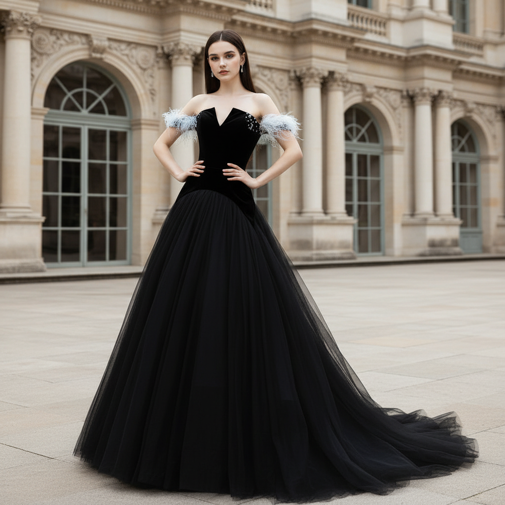 Robe de mariée en tulle noir captivante qui bouscule les conventions avec son décolleté en V audacieux et sa silhouette épaules dénudées. La jupe trapèze ondule avec grâce tandis que des perles de cristal ornent le corsage, ajoutant une touche de brillance et de relief raffinée. De délicates touches de plumes le long des épaules créent une allure éthérée et romantique qui transcende la robe de mariée traditionnelle. Parfaite pour la mariée anticonformiste en quête d'élégance audacieuse et d'une touche artistique, cette robe allie détails sophistiqués et modernité, vous assurant une allure inoubliable pour votre grand jour.