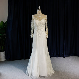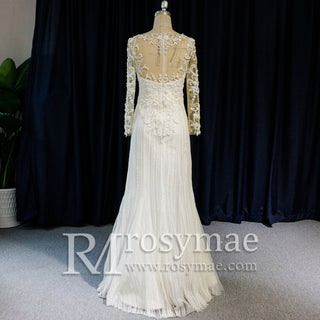 Robe de mariée illusion à manches longues en dentelle ajustée et évasée avec perles