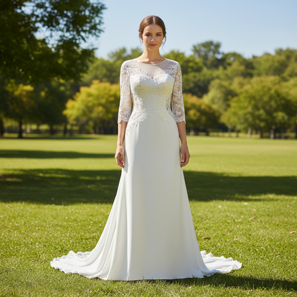 Confectionnée de manière experte, cette robe de mariée bohème présente un décolleté en cœur avec de délicats détails transparents. Les manches 3/4 ajoutent une touche élégante, tandis que la traîne en dentelle chapelle complète la silhouette trapèze. Avec un dos transparent, cette robe est parfaite pour la mariée moderne.
