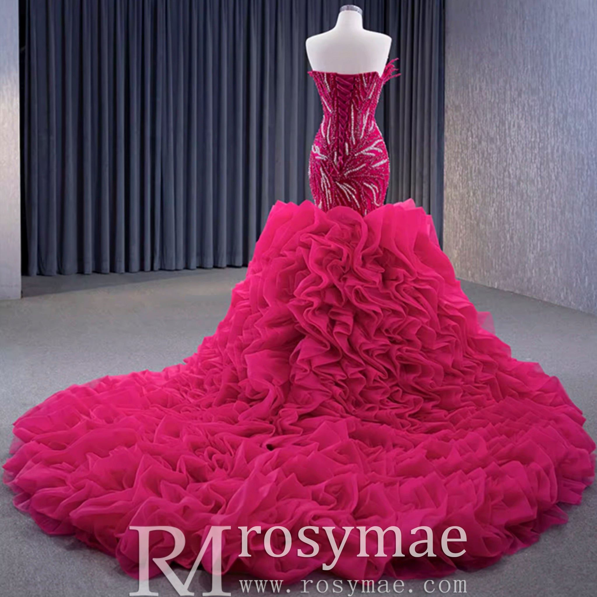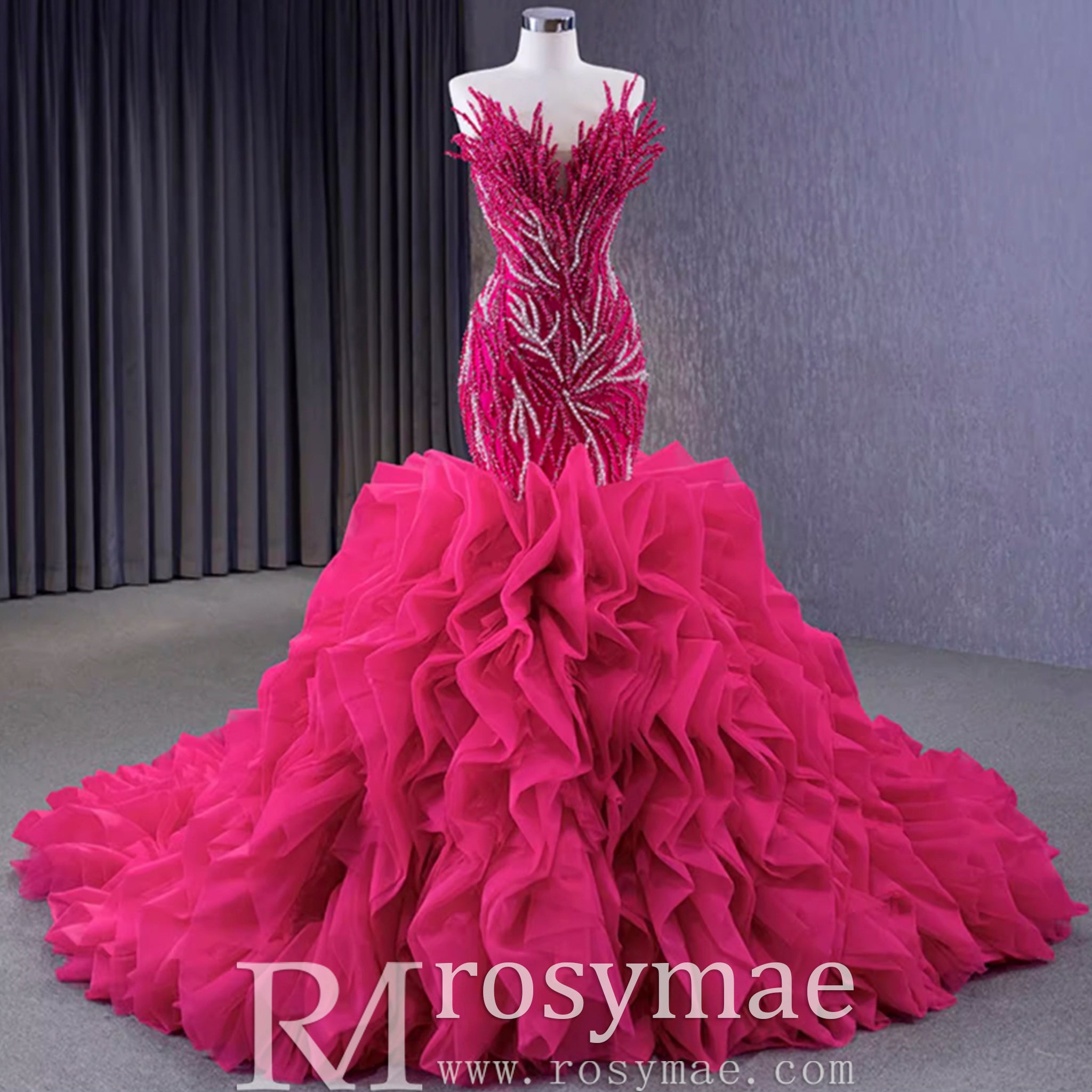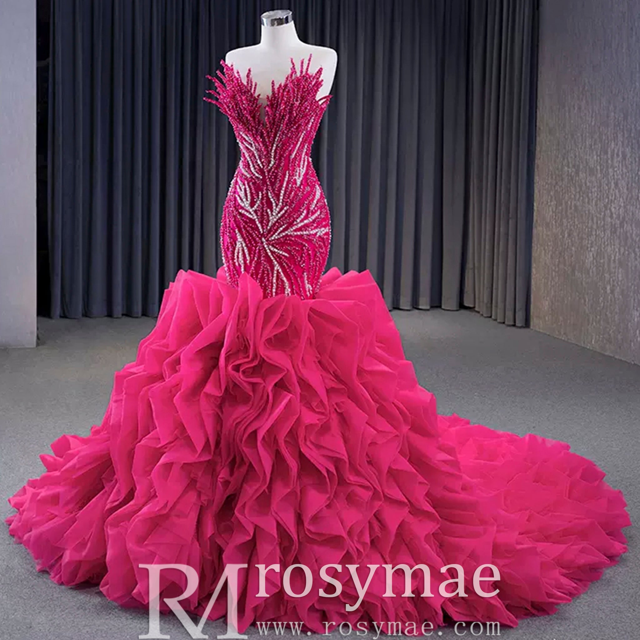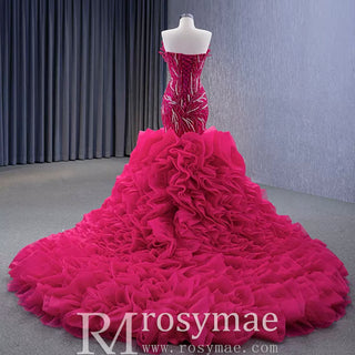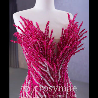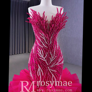 Robe de bal sirène fuchsia sans bretelles avec perles et volants