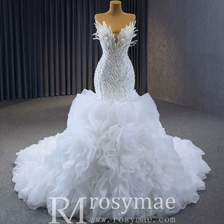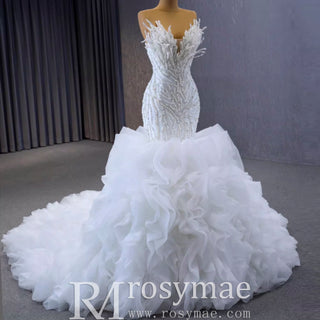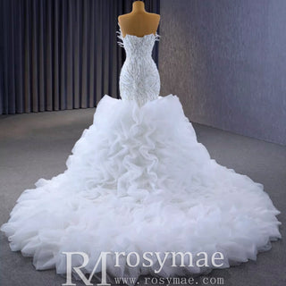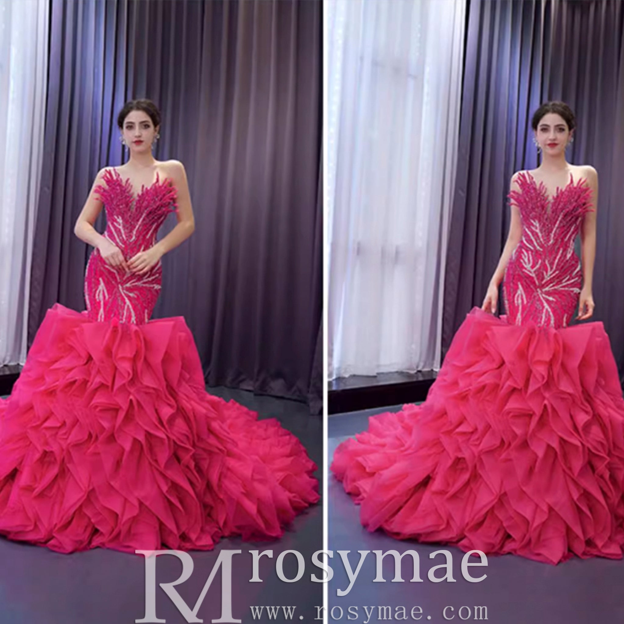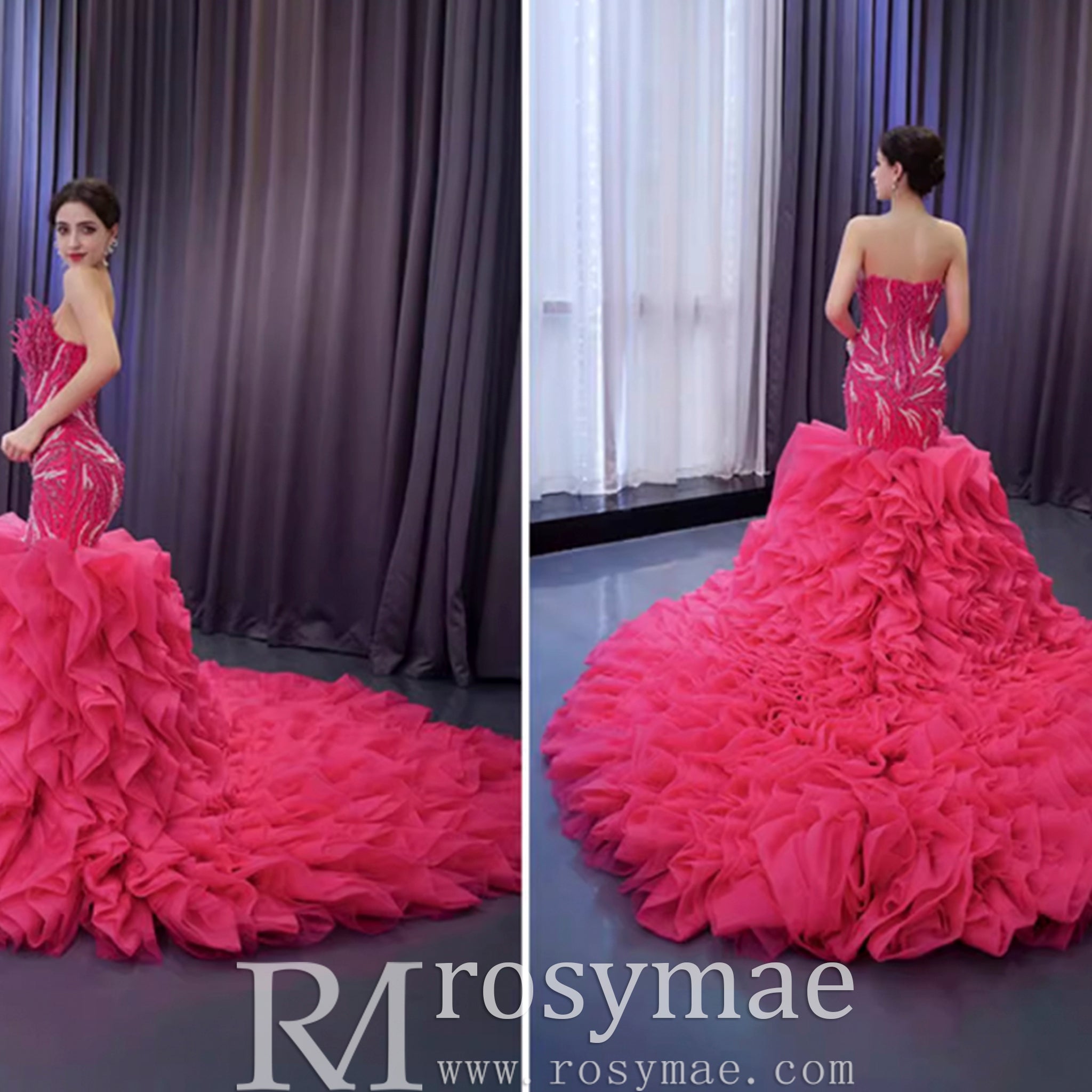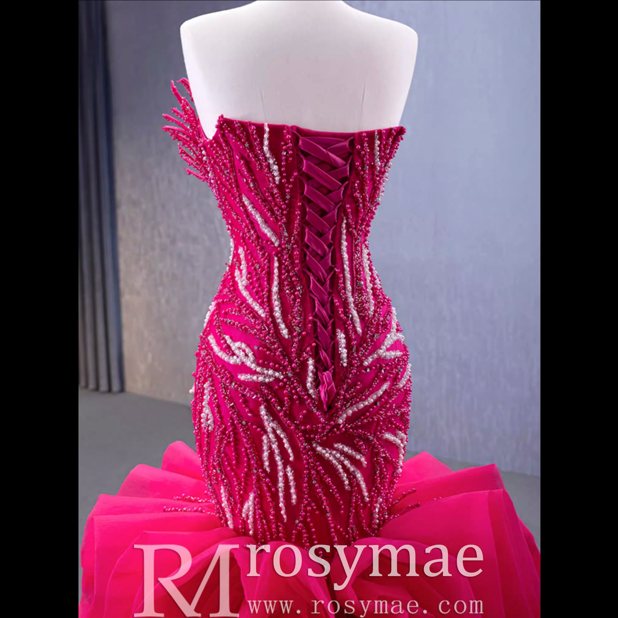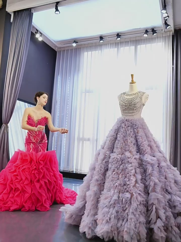 Robe de bal sirène fuchsia sans bretelles avec perles et volants