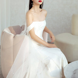 Cette superbe robe de mariée sur la plage présente une silhouette sirène élégante et élégante et un décolleté à épaules dénudées. Le tissu satiné lisse ajoute une touche d'élégance, tandis que l'encolure bateau et le design dos nu offrent une touche moderne. Parfaite pour un mariage sur la plage, cette robe fera certainement tourner les têtes et créera un look intemporel.