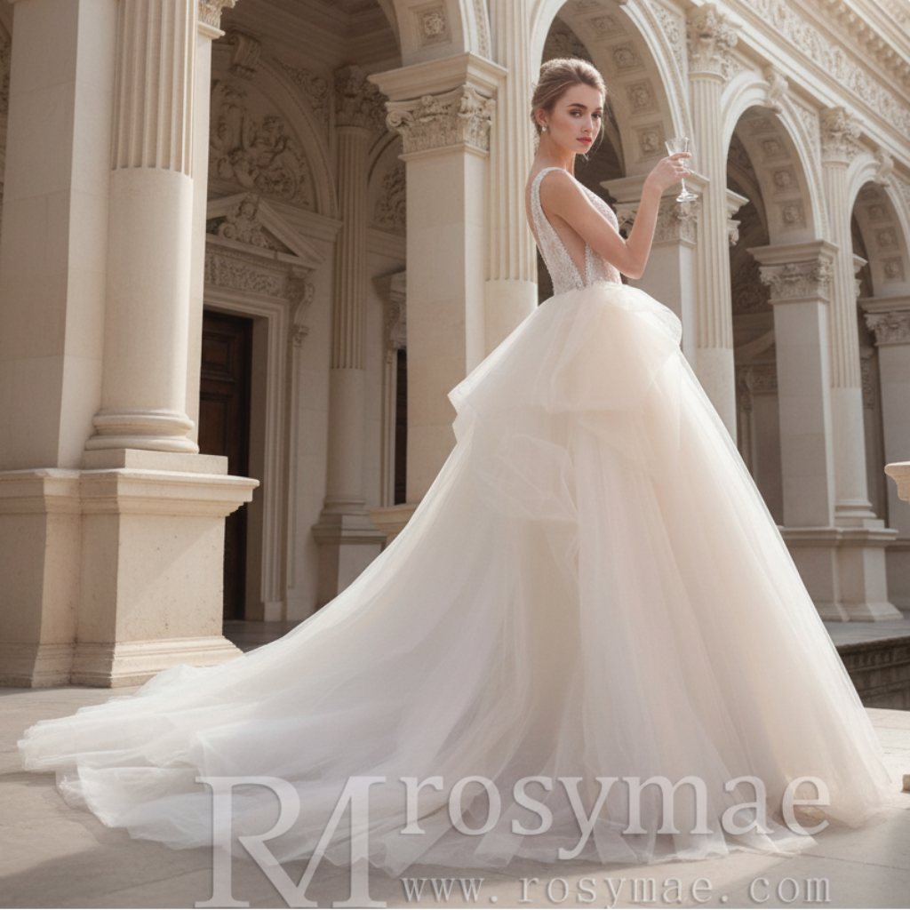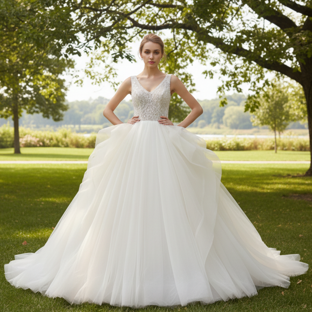Cette élégante robe de mariée de style princesse, avec son décolleté en V, ses fines bretelles et son dos nu époustouflant, est le choix idéal pour une mariée digne d'une princesse. Elle allie style et confort. Grâce à ses détails raffinés et sa coupe confortable, vous vous sentirez comme une reine le jour de votre mariage.