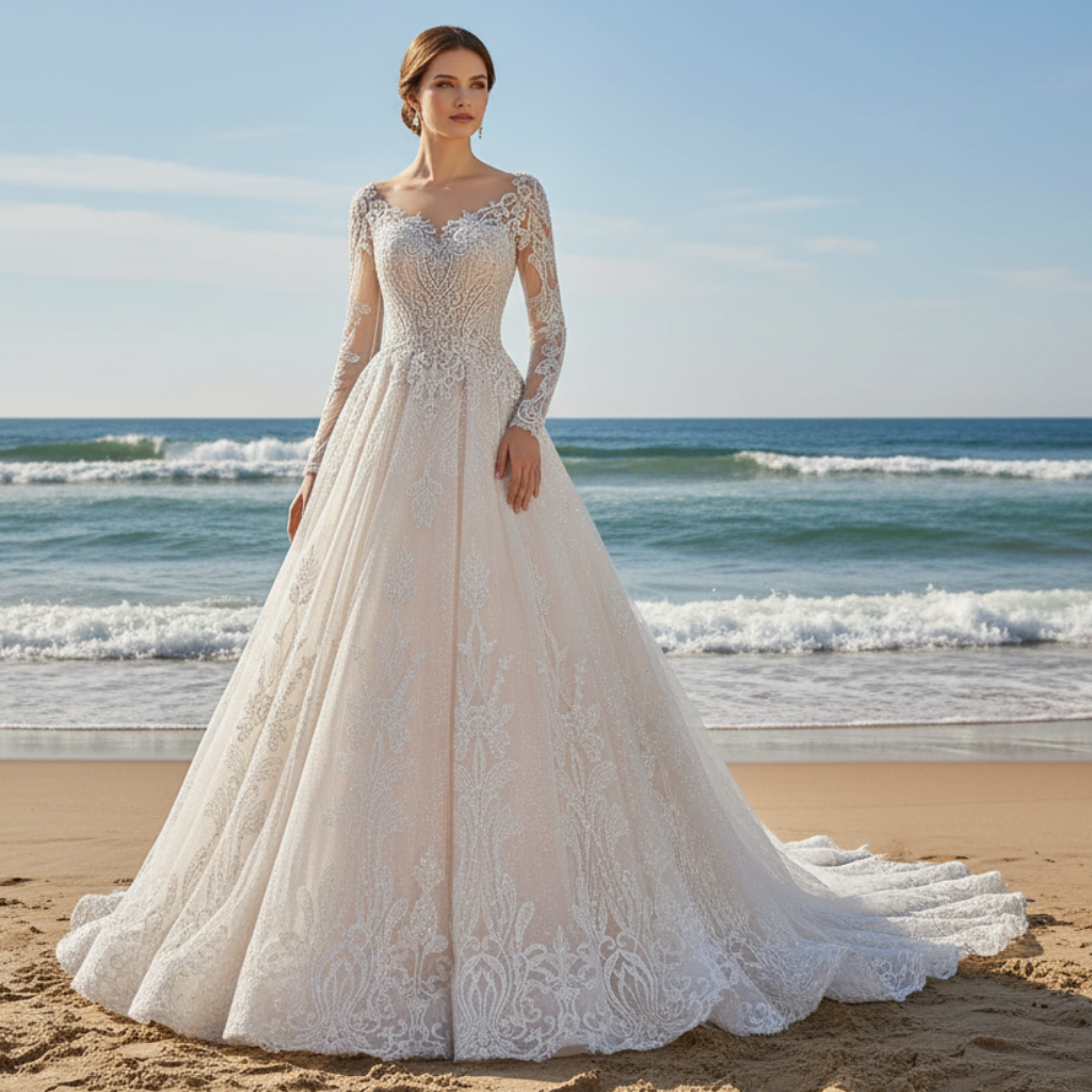 Robe de mariée élégante en dentelle scintillante à manches longues avec col en V