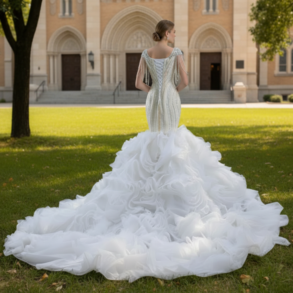 Craquez pour nos magnifiques robes de mariée sirène blanches à volants amovibles et perles ! Ornée de perles délicates et de volants somptueux, cette robe vous fera vous sentir comme une sirène le jour de votre mariage. La traîne amovible apporte une touche de polyvalence et d'élégance. Dites « oui » avec style dans cette robe de rêve !