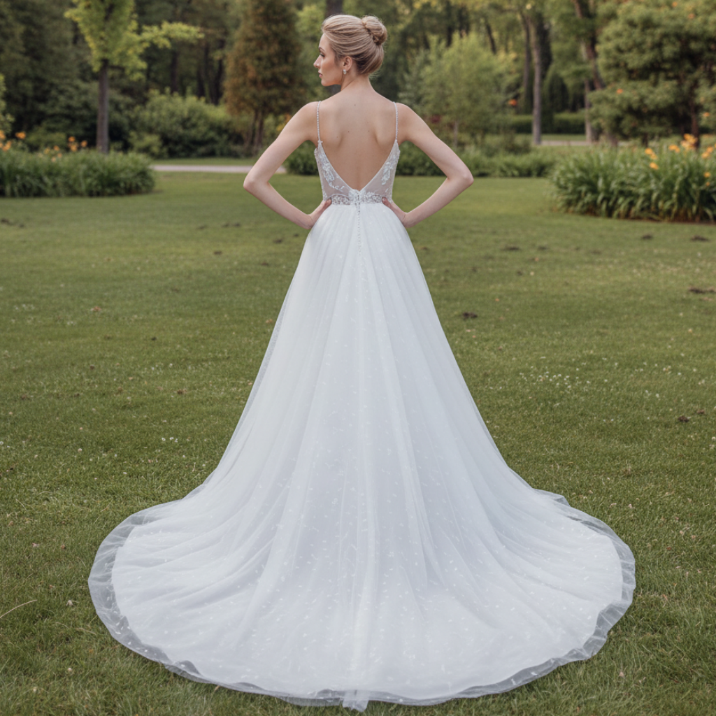 Robe de mariée sirène romantique avec dos nu, dentelle florale décore le corsage, avec des bretelles spaghetti en perles et un décolleté en cœur flatteur, des couches de tulle brumeux sont dotées d'une jupe trapèze douce et fluide qui est facile à déplacer, un magnifique dos en V bas, cette sirène La robe de mariée est parfaite pour un mariage en plein air !