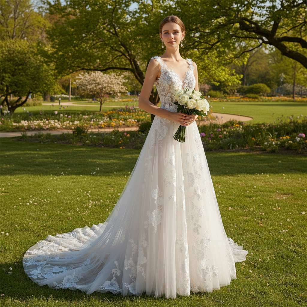 Robe de mariée trapèze classique en tulle et dentelle avec corsage transparent