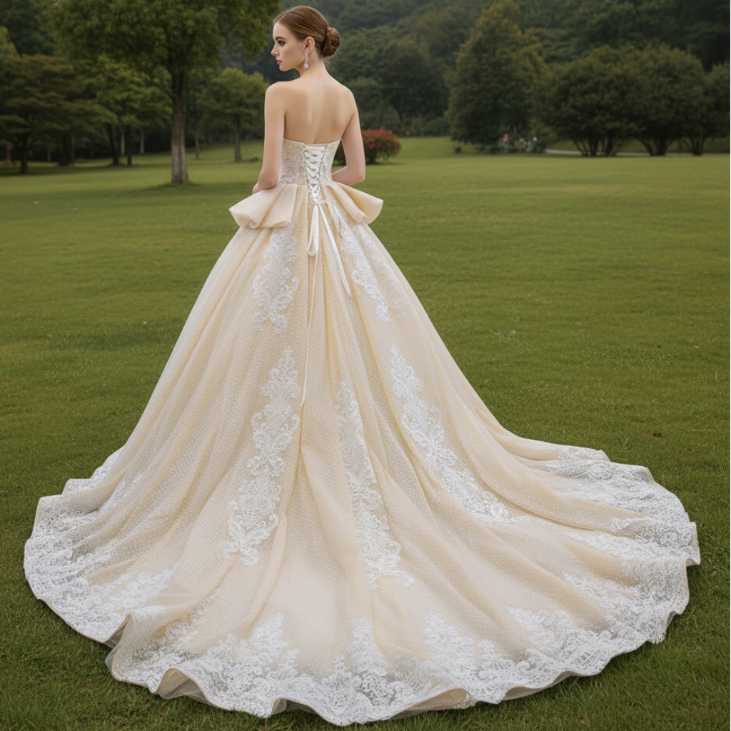 Découvrez l'élégance romantique de cette robe de mariée bustier couleur champagne. Confectionnée à la main avec de délicates applications de dentelle florale, cette robe présente une jupe bouffante et une traîne cathédrale qui vous feront vous sentir comme une princesse le jour de votre mariage. Un savoir-faire exceptionnel garantit une allure époustouflante qui laissera un souvenir impérissable.