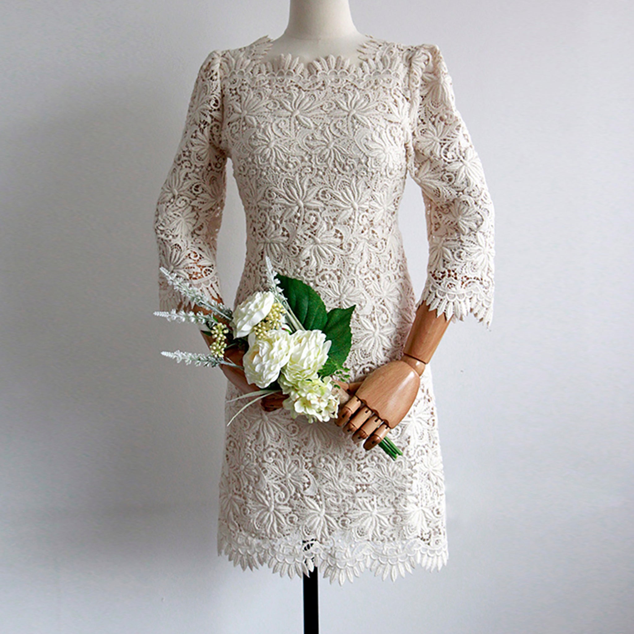 Robe de mariée élégante couleur crème, décolleté festonné, dentelle imprimée 3D, manches 3/4