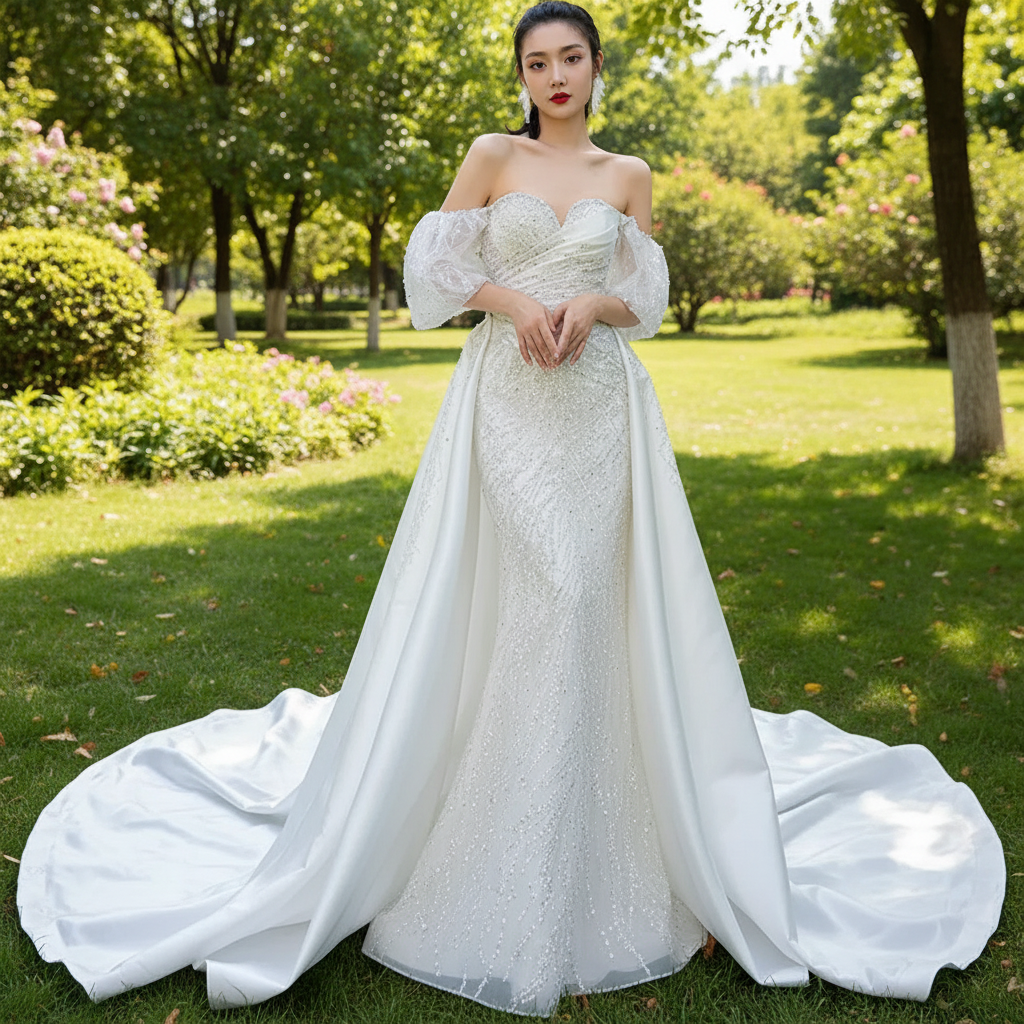 Laissez-vous séduire par l'alliance parfaite du romantisme intemporel et du design contemporain avec cette exquise robe de mariée à épaules dénudées. Confectionnée à la main avec un soin méticuleux, la robe révèle de délicates manches en dentelle qui lui confèrent élégance et une touche de charme vintage. Sa coupe fourreau ajustée sublime votre silhouette, tandis que le luxueux corsage orné de perles apporte une brillance moderne et éclatante. Véritable innovation, la jupe et la traîne amovibles vous permettent de passer avec aisance d'une tenue de cérémonie formelle à une allure plus décontractée pour la réception. Ce modèle unique et polyvalent vous assure une élégance classique et une polyvalence moderne, vous faisant rayonner de beauté à chaque instant de votre célébration.