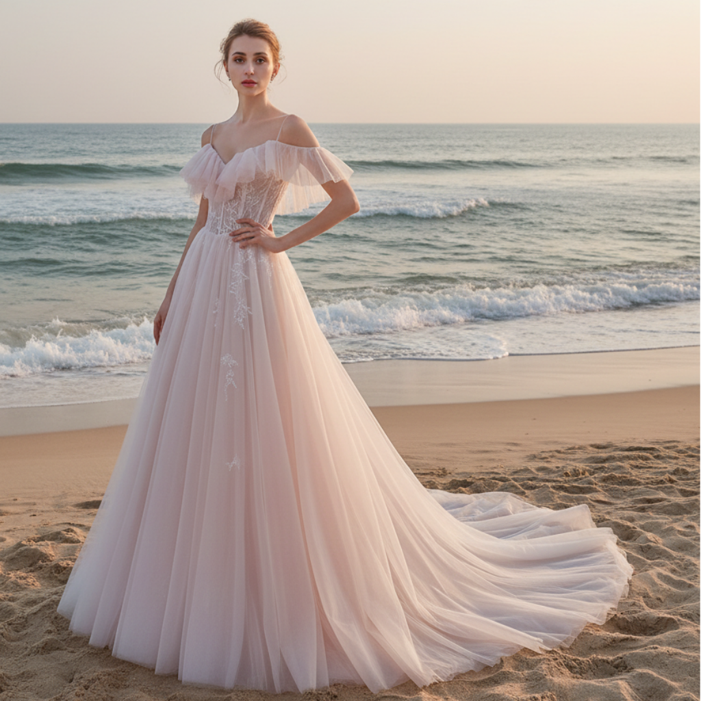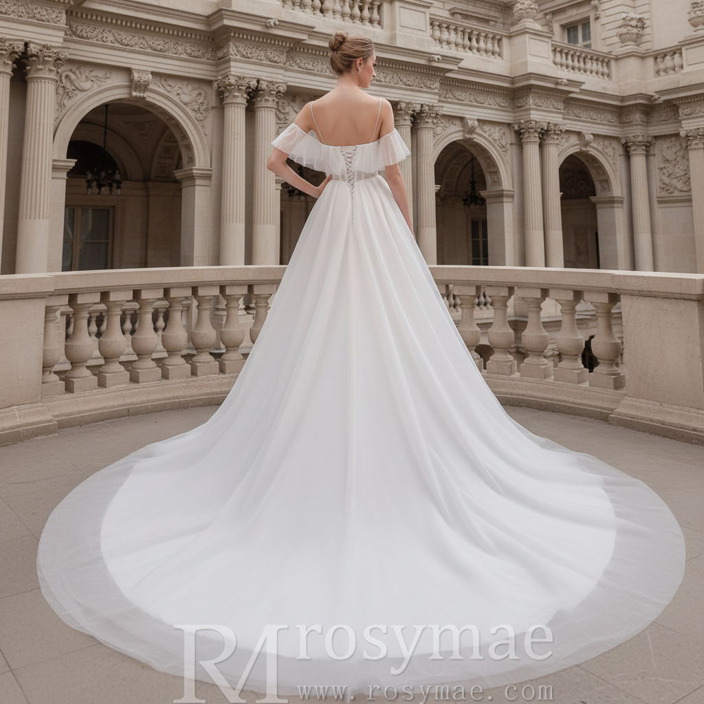 Robe de mariée jupe ligne A en tulle léger avec bretelles spaghetti