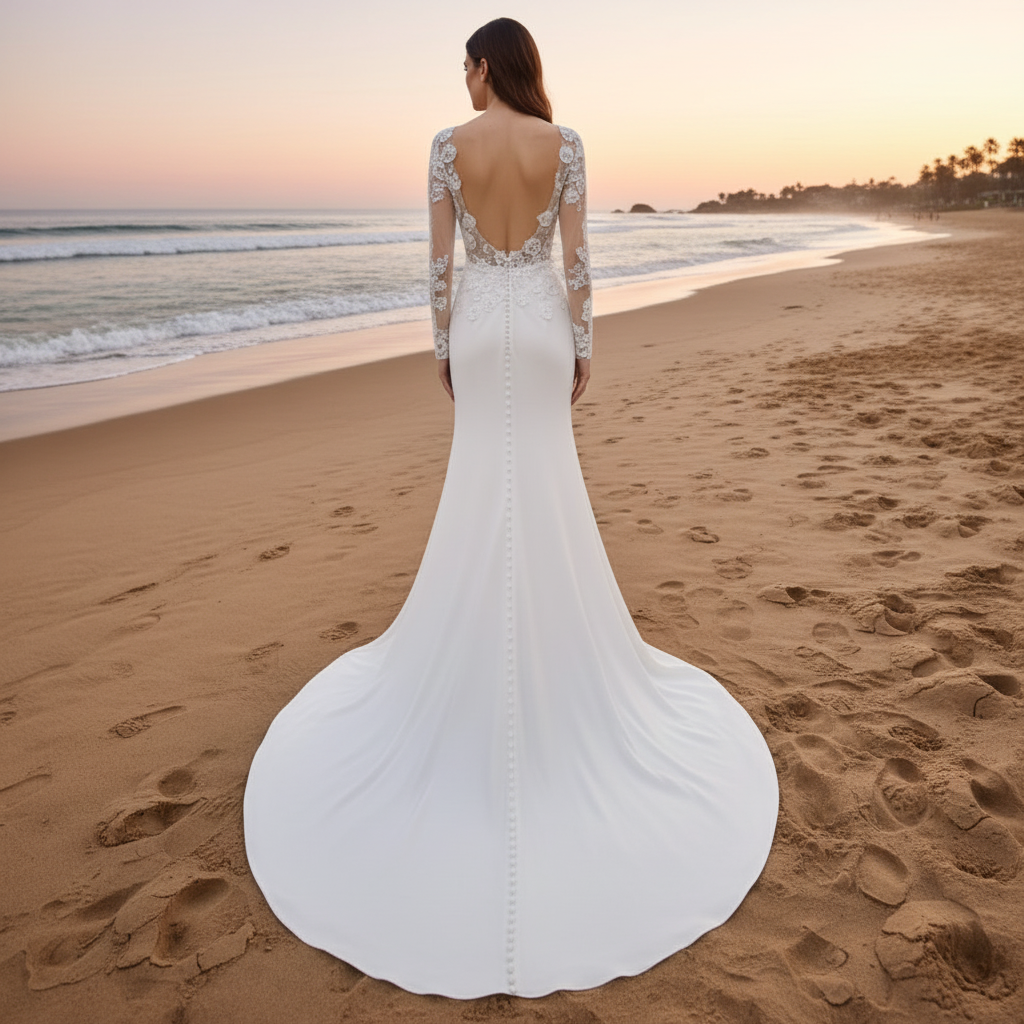 Entrez dans l'univers de votre mariage avec une grâce incomparable grâce à cette robe de mariée à manches longues transparentes, où l'élégance classique rencontre le design contemporain. Sa coupe cintrée et évasée sublime votre silhouette, tandis que le dos nu apporte une touche de charme irrésistible. De délicates appliques florales 3D, minutieusement réalisées en forme de papillons et rehaussées de cristaux scintillants, créent un point focal enchanteur sur le corsage. Les boutons recouverts de tissu aux poignets ajoutent une sophistication subtile, complétant l'esthétique raffinée. Les manches longues transparentes offrent une couvrance délicate sans compromettre le style, et la fente audacieuse à la jambe insuffle une touche de modernité et de fraîcheur, pour une liberté de mouvement totale. Parfaite pour les mariées en quête d'une robe alliant détails romantiques et assurance, cette robe vous garantit d'enchanter tous vos invités et de rayonner du début à la fin de la soirée.