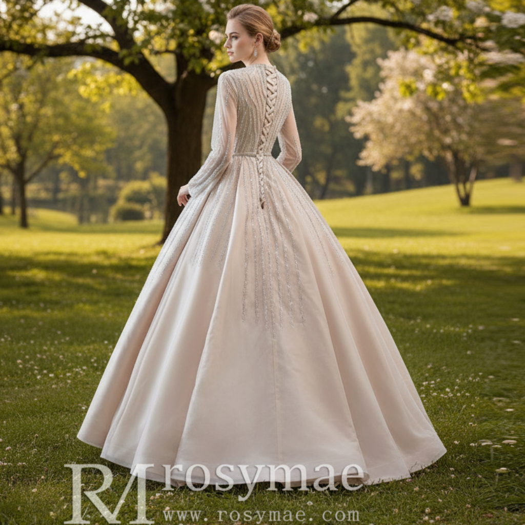 Faites une entrée inoubliable dans cette robe de bal d'exception, confectionnée à la main, qui allie élégance classique et éclat contemporain. Son col rond montant apporte une sophistication discrète, tandis que ses manches longues ornées de perles créent un écrin lumineux à votre silhouette. De délicates broderies de perles ornent le corsage et la jupe, captant la lumière à chaque mouvement pour un effet visuel maximal. La coupe trapèze flatte toutes les morphologies, tandis que les matières haut de gamme garantissent confort et durabilité tout au long de votre événement. Chaque robe est réalisée individuellement par des artisans qualifiés, à partir de tissus de haute qualité et avec un souci du détail méticuleux. La silhouette intemporelle à col montant transcende les tendances éphémères, faisant de cette pièce un choix idéal pour les bals de fin d'année, les galas, les quinceañeras et autres célébrations importantes. Les perles raffinées transforment cette robe en une pièce maîtresse qui reflète votre goût exquis et votre assurance.