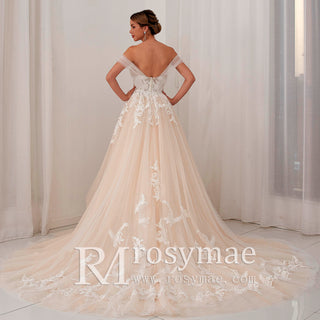 Off épaule dentelle florale robe de bal nuptiale robe de mariée cathédrale train