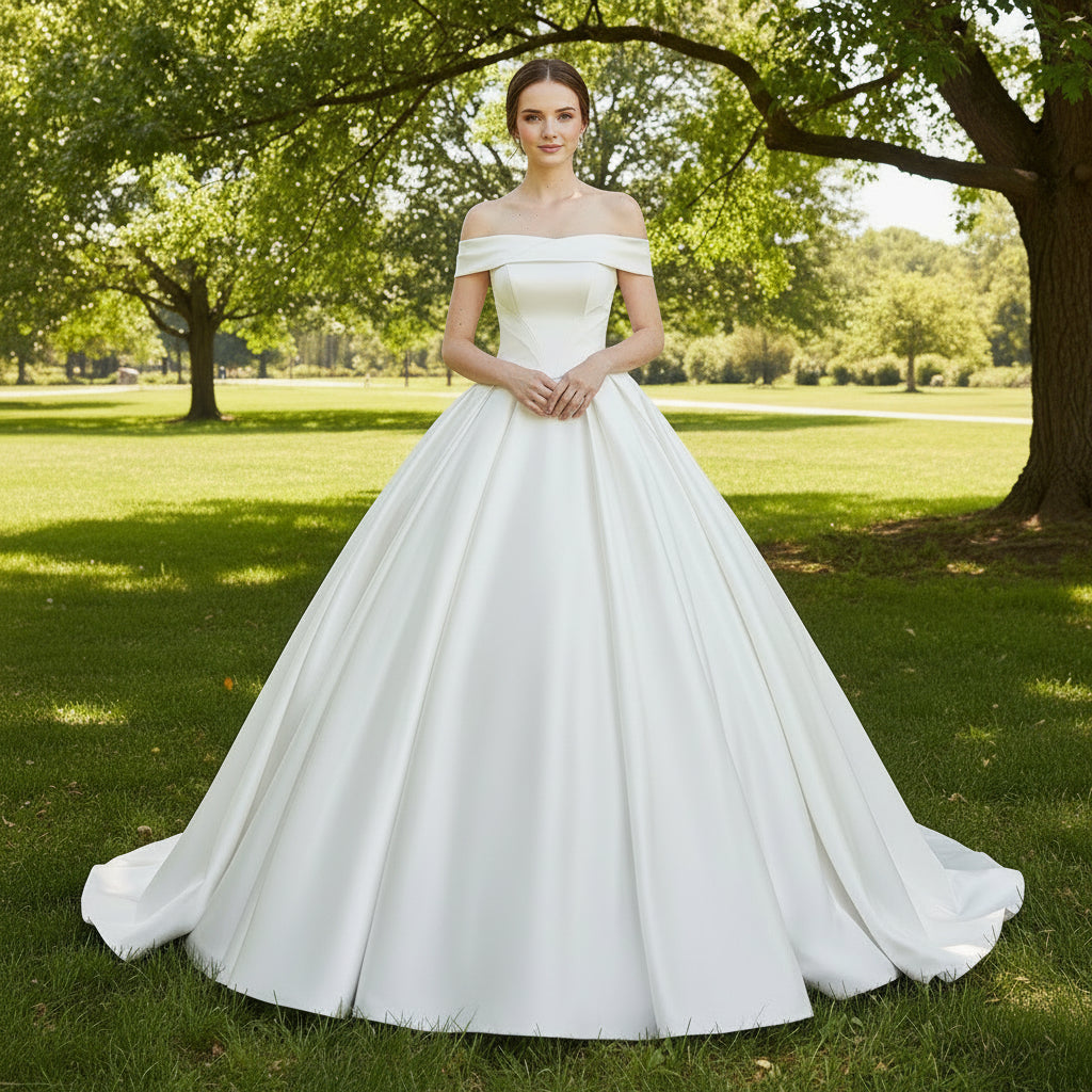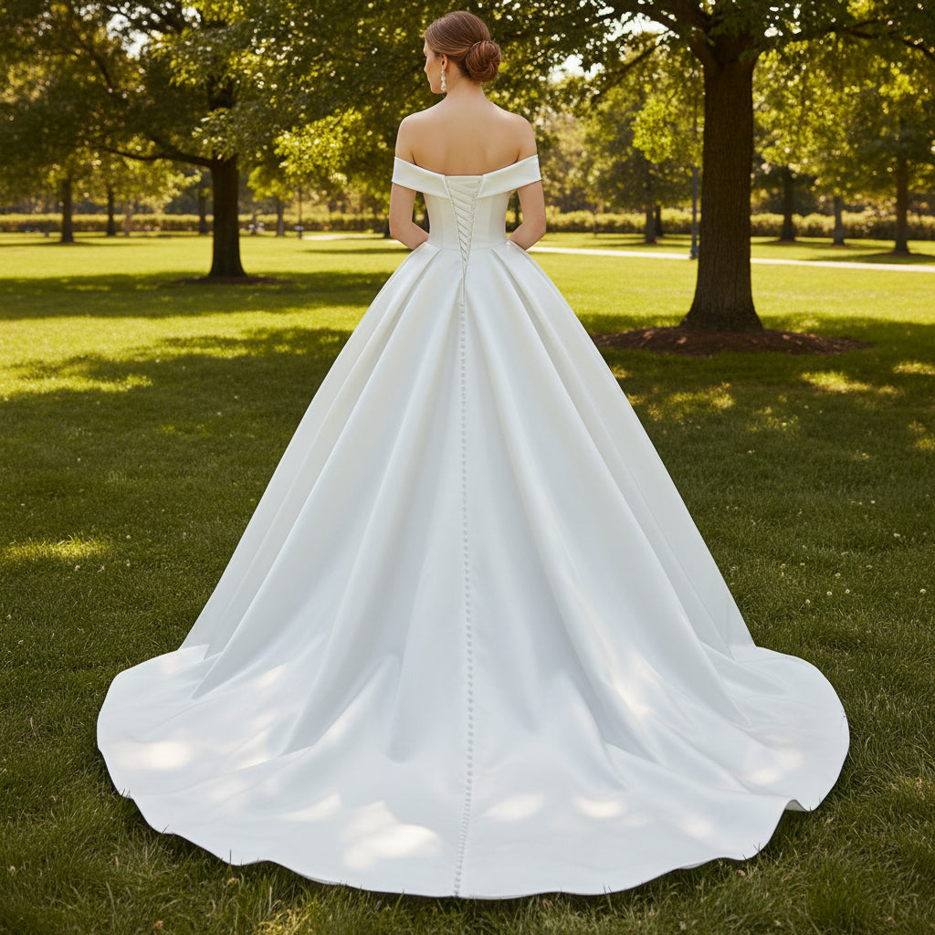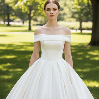 Cette robe de mariée à épaules dénudées présente un décolleté droit et une jupe bouffante volumineuse, créant une silhouette de robe de bal intemporelle et élégante. Fabriqué à partir de tissu satiné luxueux, il ajoute une touche de sophistication et de grâce à votre journée spéciale.