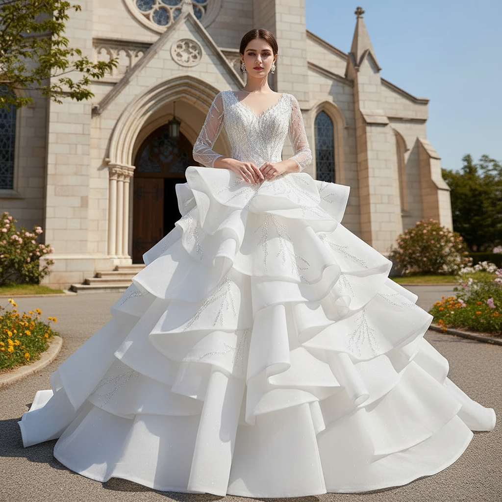 Cette robe de mariée, confectionnée à la main avec un soin exceptionnel, allie avec brio l'élégance classique à un romantisme moderne. Son décolleté en V gracieux se prolonge en de délicates manches longues, réalisées en dentelle transparente ornée de perles fines qui captent la lumière d'un doux éclat. Des volants d'organza superposés créent texture et mouvement, tandis qu'un col montant raffiné et un dos transparent lui confèrent une sophistication intemporelle. Conçue avec une attention méticuleuse aux détails, cette robe vous assure de rayonner de grâce et de confiance le jour de votre mariage de rêve.