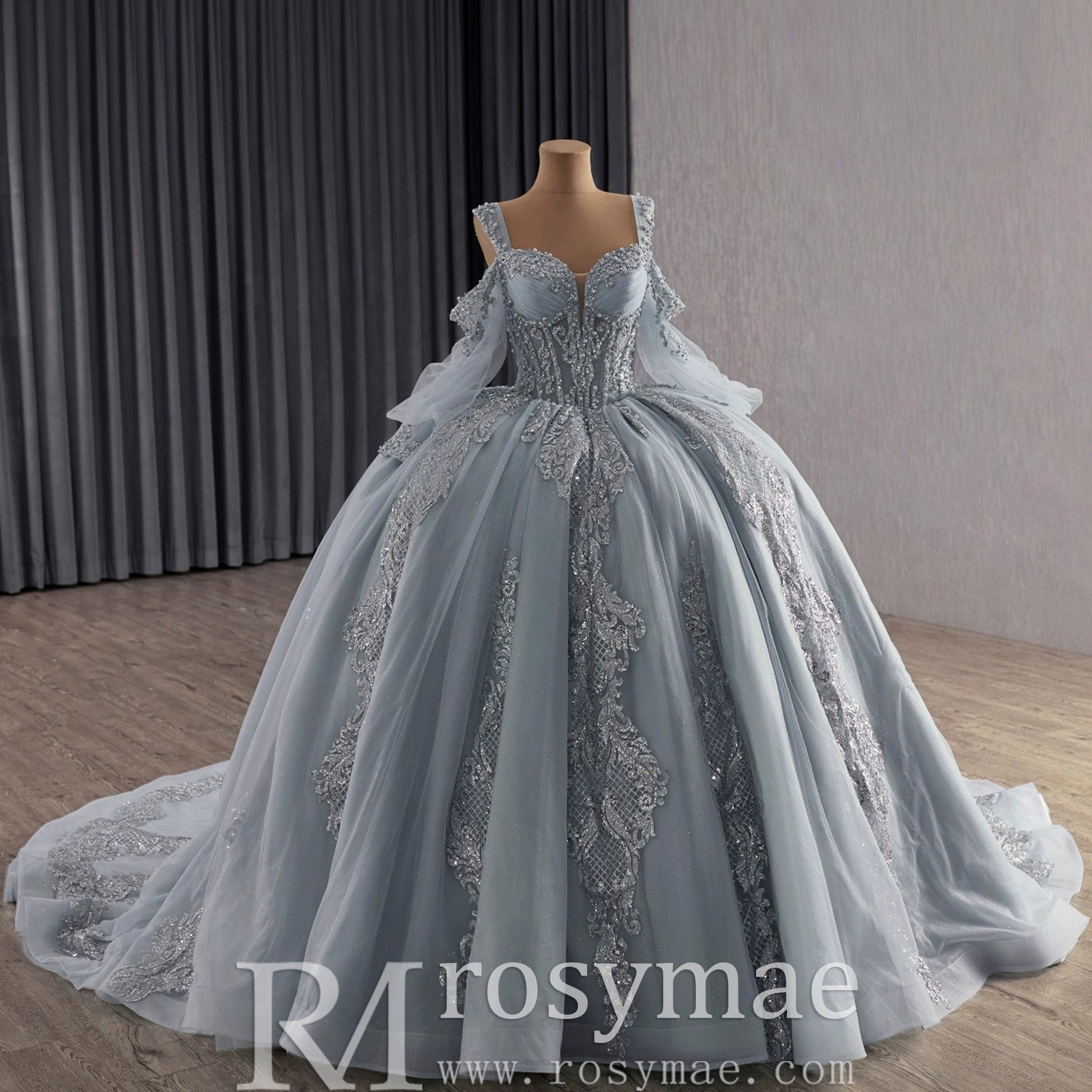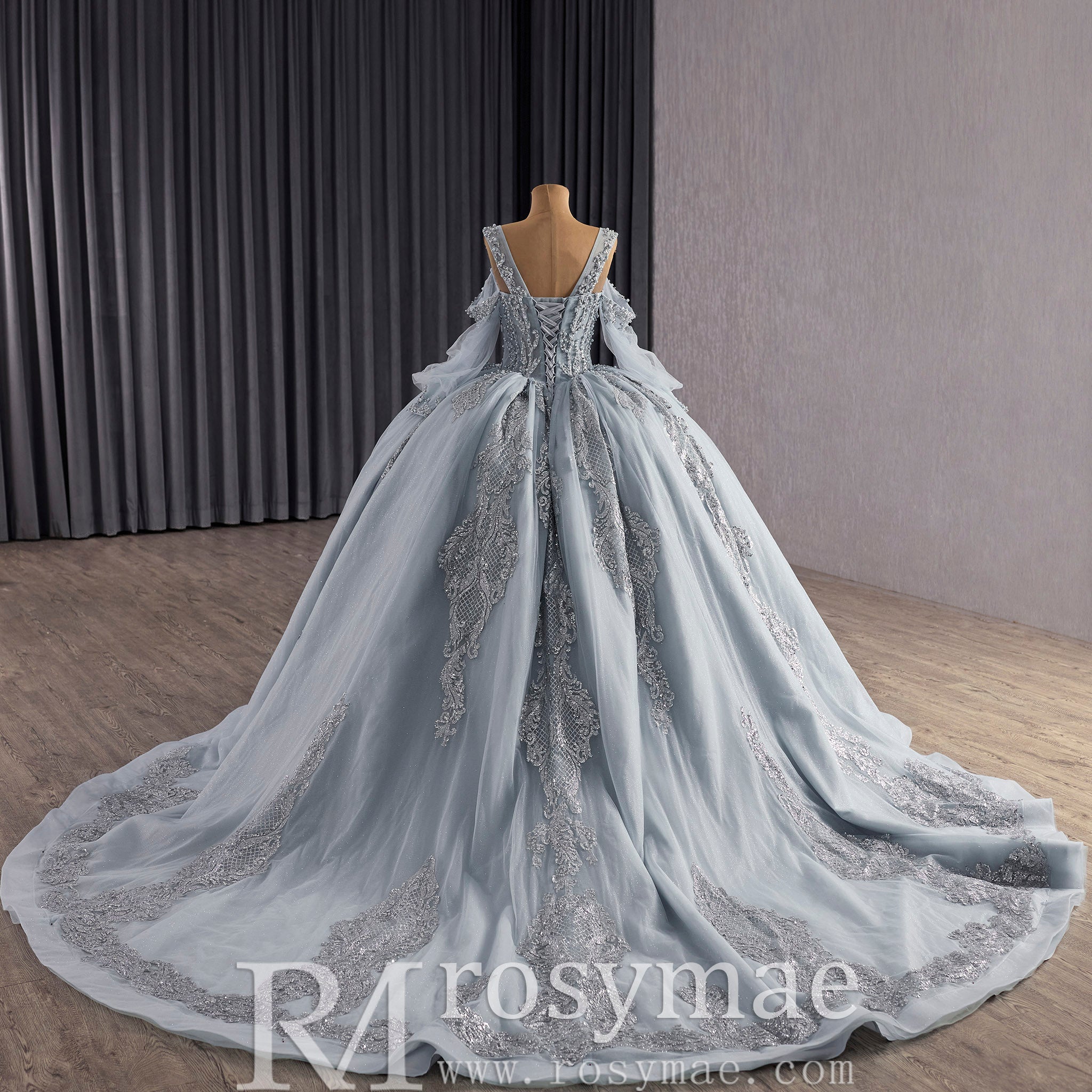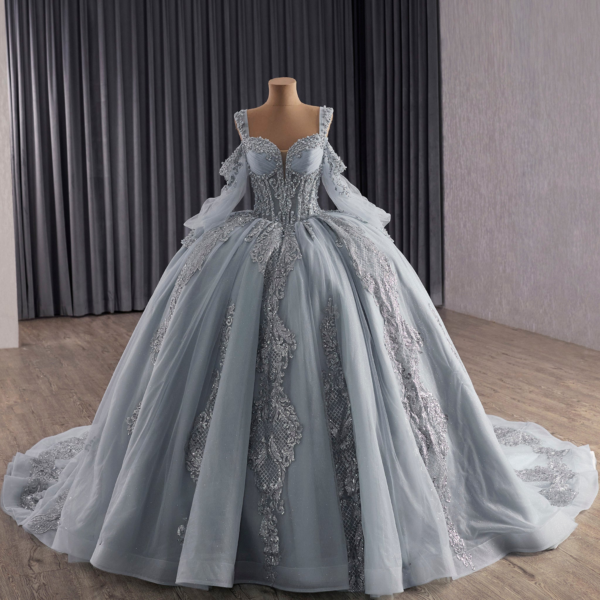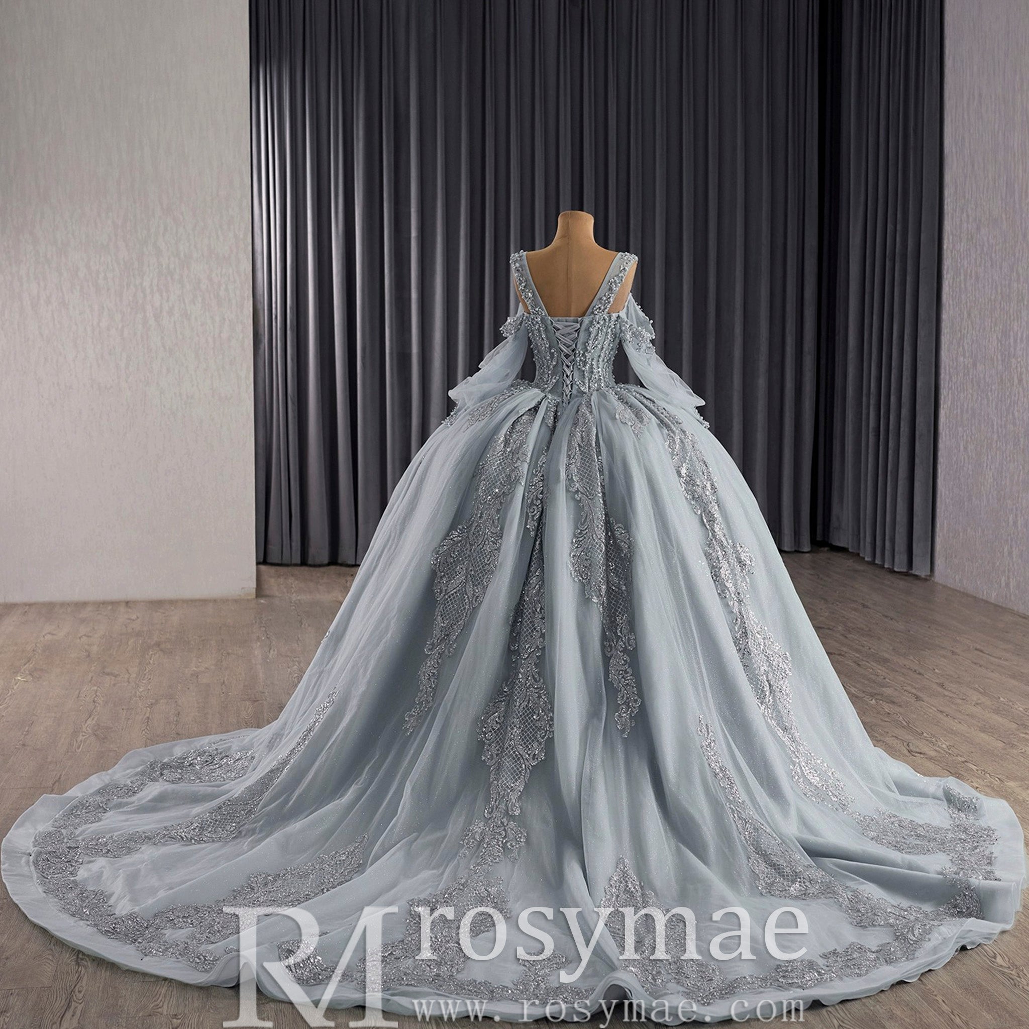 Célébrez votre quinceañera dans un luxe absolu avec cette exquise robe bustier à épaules dénudées, symbole d'élégance, de raffinement et de beauté intemporelle. Le corsage, confectionné avec une minutie extrême, est orné de sequins scintillants et délicatement rehaussés de perles chatoyantes qui captent la lumière à chaque mouvement gracieux. La superposition de tulle transparent et brillant apporte une touche de glamour contemporain tout en conservant une sophistication raffinée, créant une profondeur et une dimension visuelles qui élèvent cette robe au-delà des tenues de cérémonie ordinaires. La taille bustier, taillée avec précision, épouse parfaitement vos courbes naturelles, créant une silhouette en sablier flatteuse qui célèbre votre féminité avec une élégance discrète. Le décolleté épaules dénudées met en valeur vos épaules et votre clavicule avec une sophistication moderne, tandis que les manches longues ajoutent une touche de charme et de raffinement classiques. Ces manches équilibrent le design contemporain des épaules dénudées avec une élégance intemporelle, créant une silhouette harmonieuse qui convient aussi bien à la cérémonie qu'à la réception. Le laçage innovant au dos offre un ajustement personnalisé, vous permettant de régler la robe à la perfection pour un confort et une confiance optimaux tout au long de cette journée si spéciale. La traîne cathédrale spectaculaire est le joyau de cette robe : une allure majestueuse qui flotte derrière vous lors de votre entrée triomphale, créant un impact visuel inoubliable. Chaque point témoigne d'un savoir-faire exceptionnel et d'une attention particulière aux détails, faisant de cette robe un précieux héritage familial. C'est la fusion parfaite du charme classique et de l'éclat contemporain, conçue pour vous faire rayonner, vous sentir confiante et inoubliable lors de votre passage à l'âge adulte et de la célébration de cette étape transformatrice entourée de vos proches.
