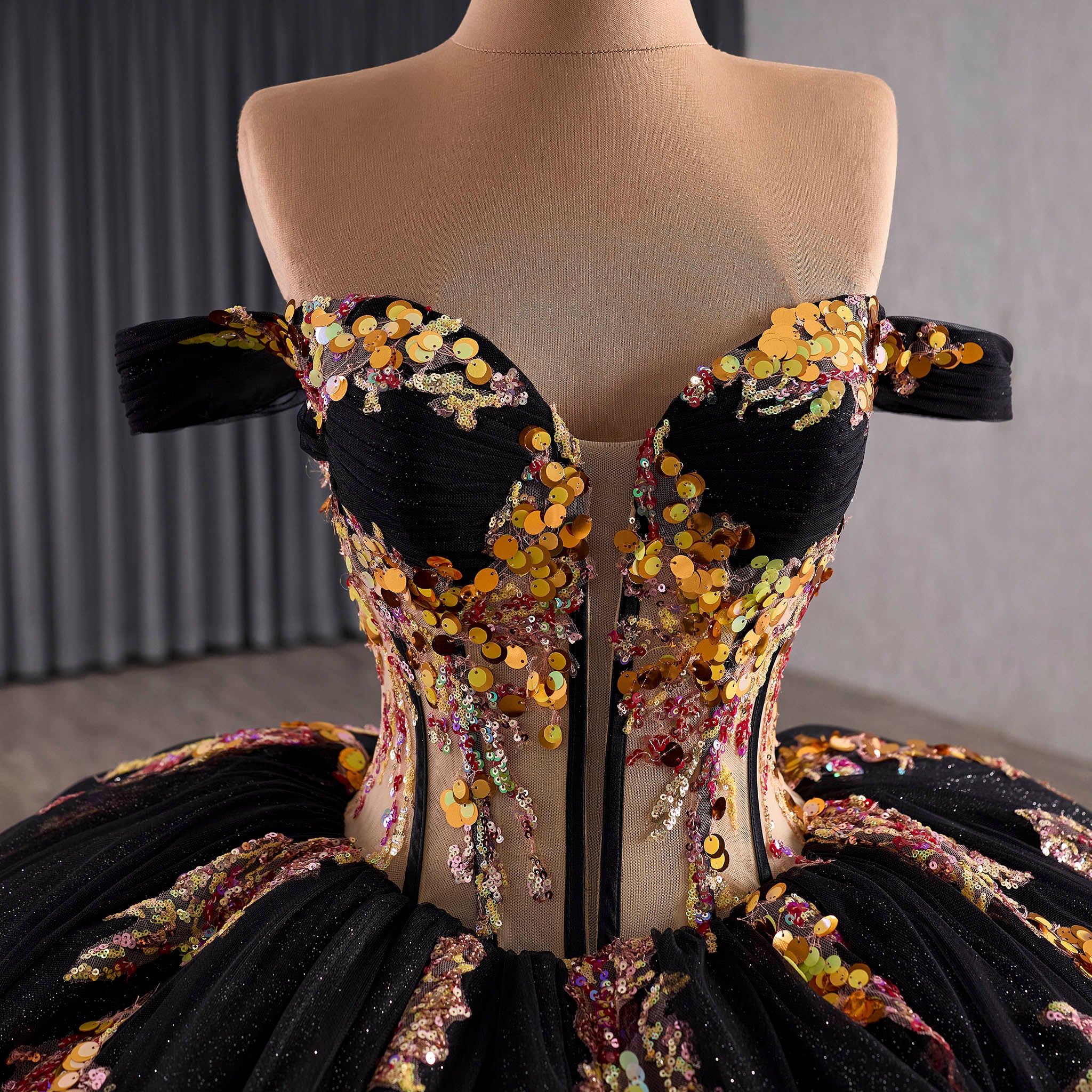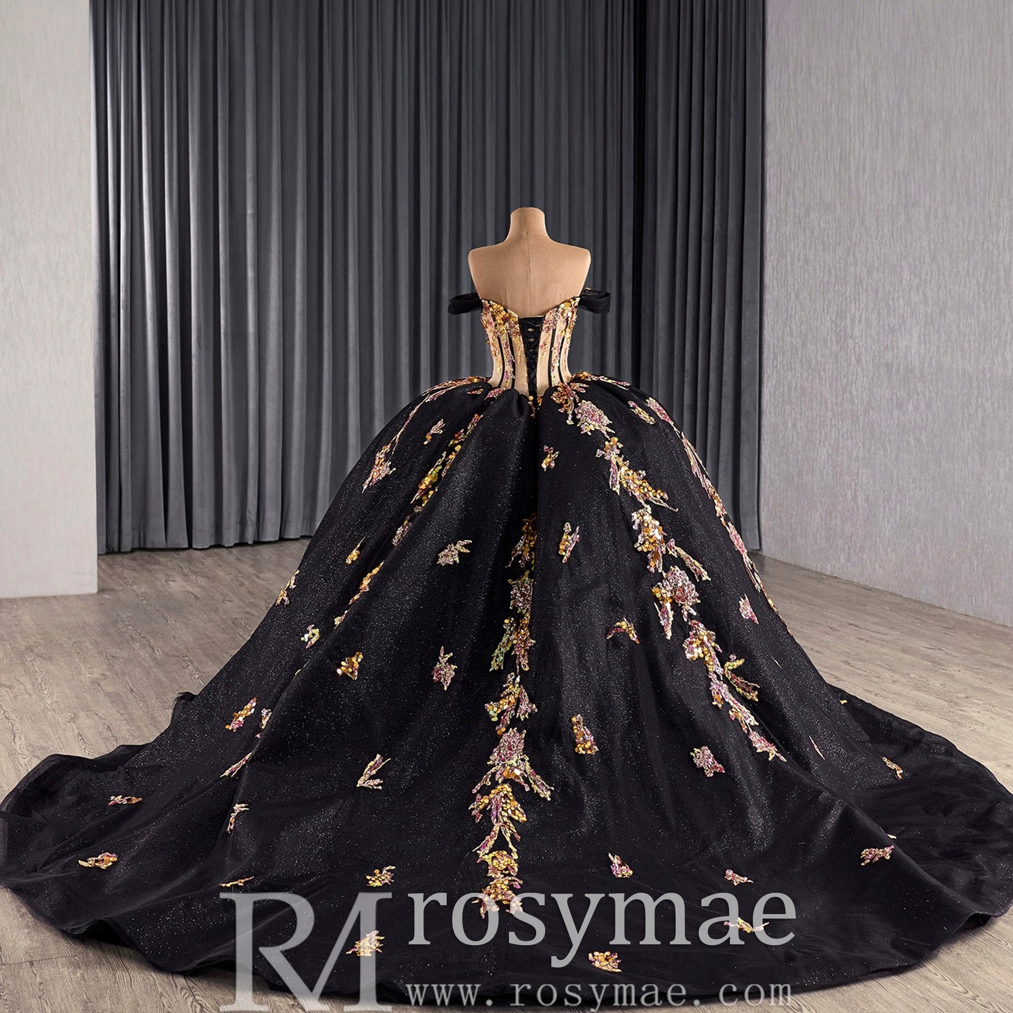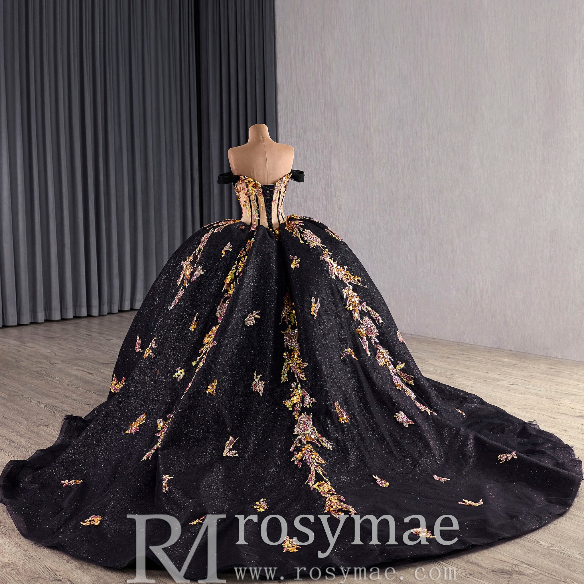 Robe de quinceañera noire élégante à épaules dénudées et bouffante pour les jeunes filles de 15 à 16 ans