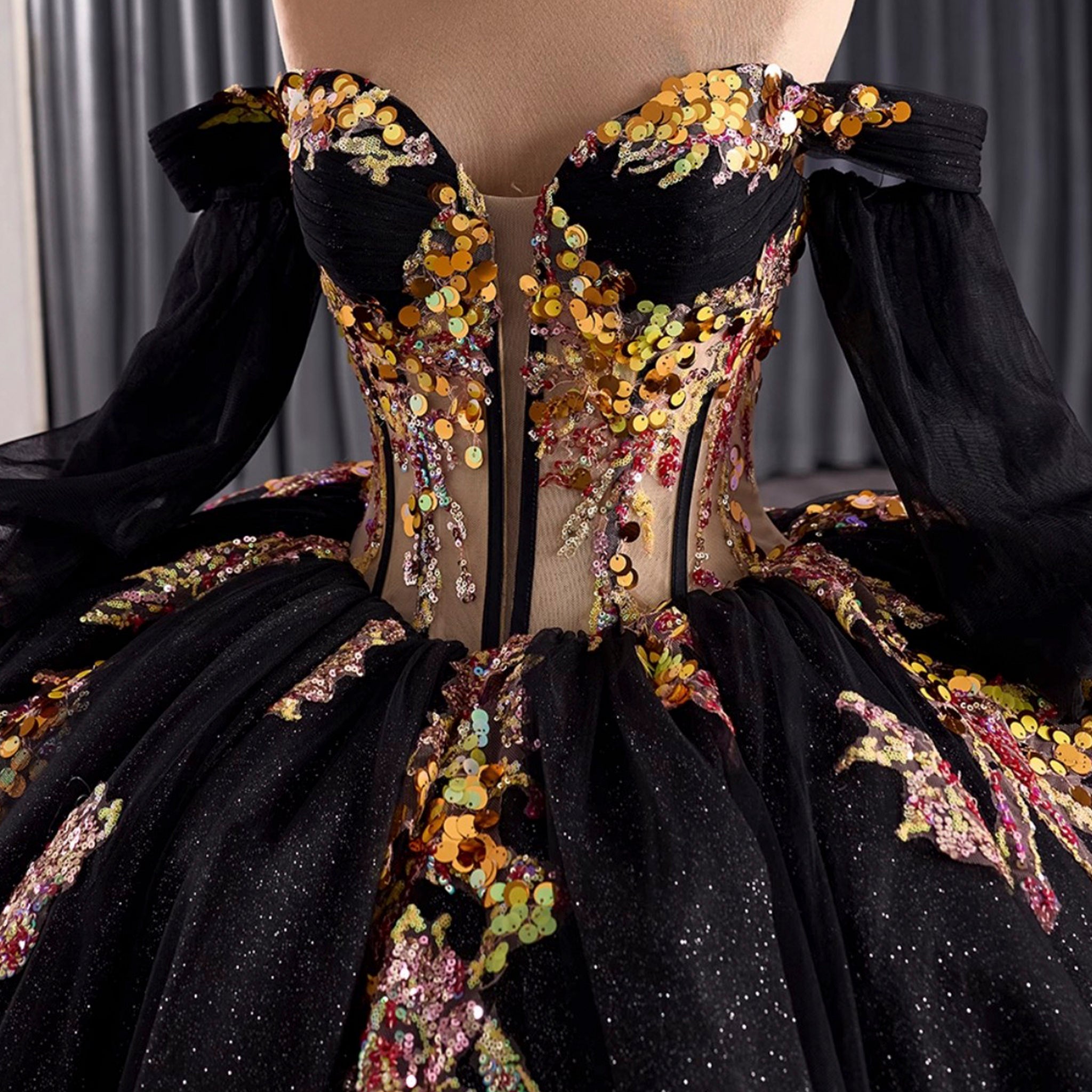 Sublimez votre moment avec cette robe de quinceañera noire à épaules dénudées absolument époustouflante, qui allie à la perfection élégance intemporelle et glamour contemporain. Le décolleté sophistiqué met en valeur vos épaules et votre clavicule, créant une silhouette chic et moderne qui respire la confiance et le style. Les ingénieuses manches longues amovibles offrent une polyvalence incomparable : portez-les pour une allure raffinée et couverte pendant la cérémonie, puis retirez-les pour dévoiler une silhouette audacieuse épaules nues, idéale pour danser et faire la fête. Cette flexibilité vous permet de passer d'un moment à l'autre en toute fluidité, en adaptant votre look à chaque instant. Le corsage transparent est un véritable point focal, minutieusement orné de sequins dorés scintillants sur un tulle délicat qui capte magnifiquement la lumière à chaque mouvement. Le contraste entre le noir profond du tissu et les ornements dorés étincelants crée une profondeur visuelle et une sophistication qui attirent tous les regards. La jupe bouffante et volumineuse offre une présence et un mouvement spectaculaires, parfaits pour virevolter et immortaliser des moments inoubliables. Ce qui sublime véritablement cette robe, c'est sa magnifique traîne cathédrale : un ajout majestueux et ample qui crée une silhouette impressionnante pour votre entrée remarquée. La traîne ondule gracieusement derrière vous, ajoutant une touche de majesté et de sophistication qui transforme cette robe en une pièce maîtresse. Chaque détail a été soigneusement pensé pour que vous vous sentiez absolument radieuse, confiante et inoubliable lors de la célébration de vos 15 ou 16 ans. Cette robe n'est pas qu'une simple tenue de cérémonie : c'est votre moment pour briller de mille feux et créer des souvenirs impérissables.