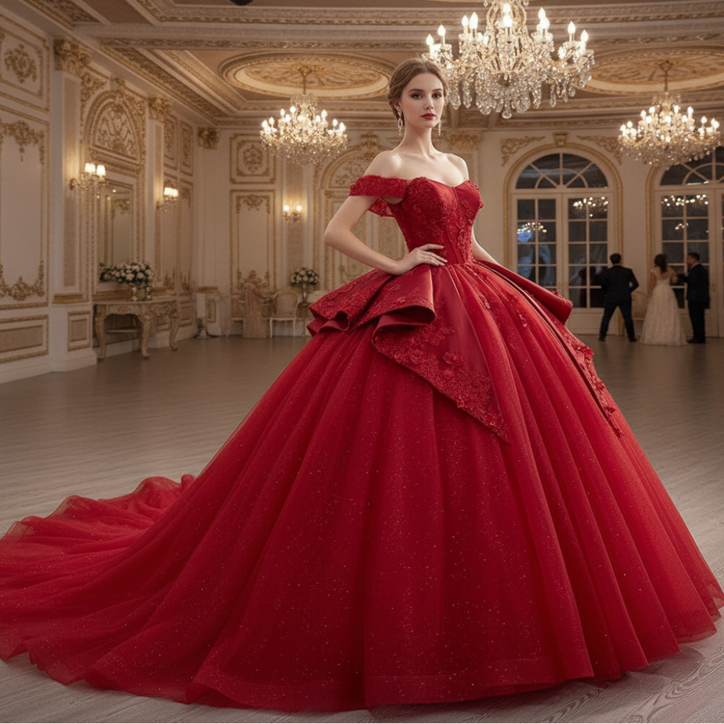 Conçue avec soin pour votre grand jour, cette robe de mariée rouge scintillante à taille basque est dotée d'un tulle scintillant haut de gamme, d'appliques de fleurs en dentelle et d'une jupe accrocheuse. Le design à épaules dénudées et le dos bas ajoutent une touche d'élégance, tandis que le style sans manches et la traîne cathédrale en font une robe vraiment époustouflante. Parfait pour une quinceanera ou un jour de mariage mémorable.