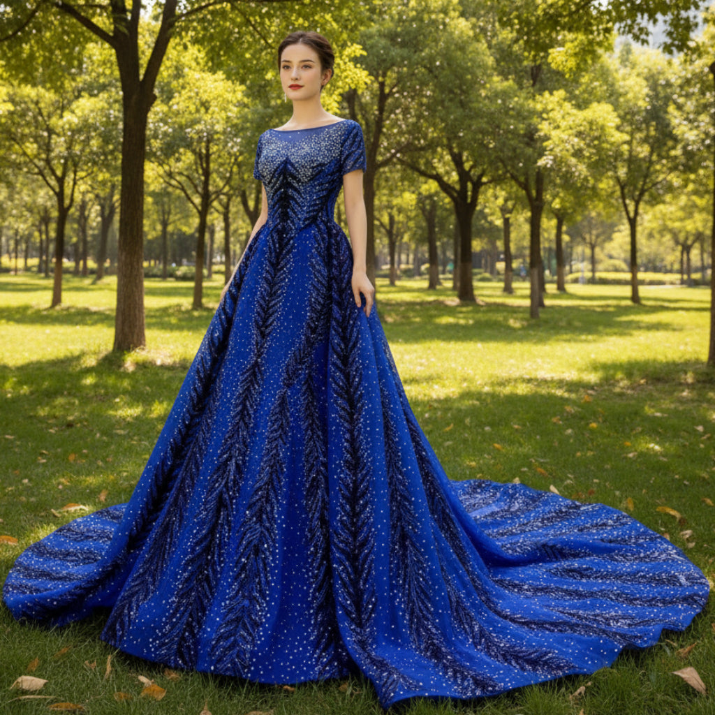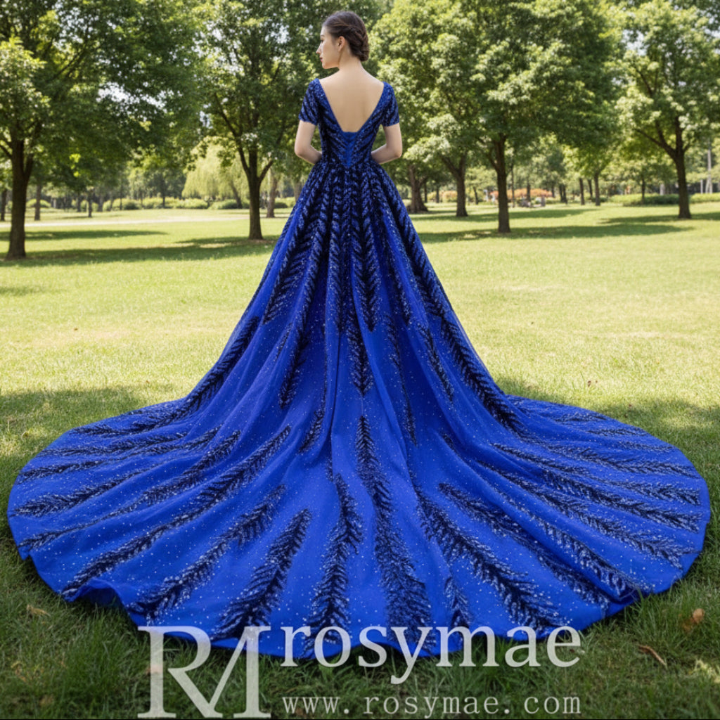 Soyez la belle du bal dans cette superbe robe de bal et robe de soirée bleu royal scintillante fabriquée à la main. Avec ses manches courtes, son design sirène et son dos échancré, cette robe respire l'élégance et la grâce. La traîne amovible et l'encolure bateau ajoutent polyvalence et sophistication. Parfaite pour toute occasion spéciale, cette robe vous fera ressembler et vous sentir comme une royauté.