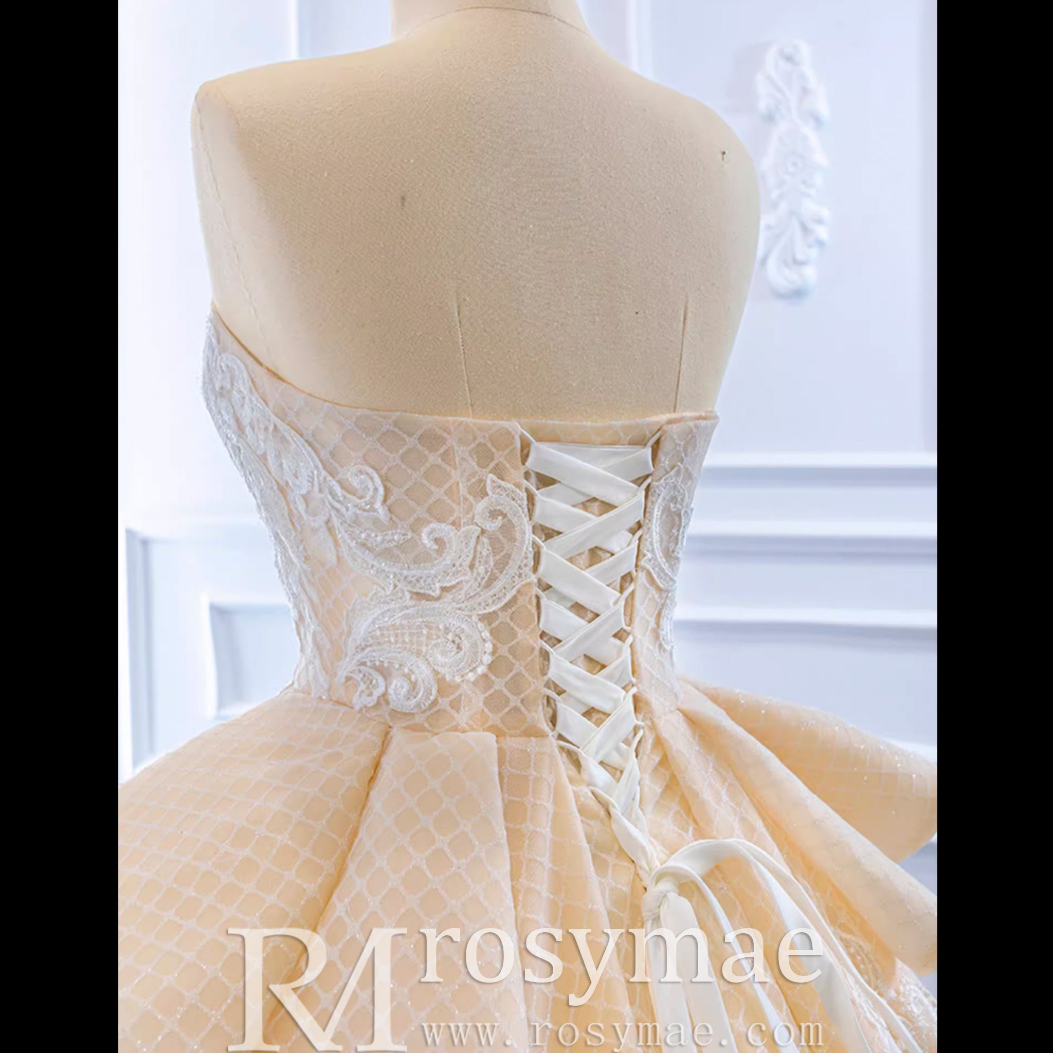 Découvrez l'élégance romantique de cette robe de mariée bustier couleur champagne. Confectionnée à la main avec de délicates applications de dentelle florale, cette robe présente une jupe bouffante et une traîne cathédrale qui vous feront vous sentir comme une princesse le jour de votre mariage. Un savoir-faire exceptionnel garantit une allure époustouflante qui laissera un souvenir impérissable.