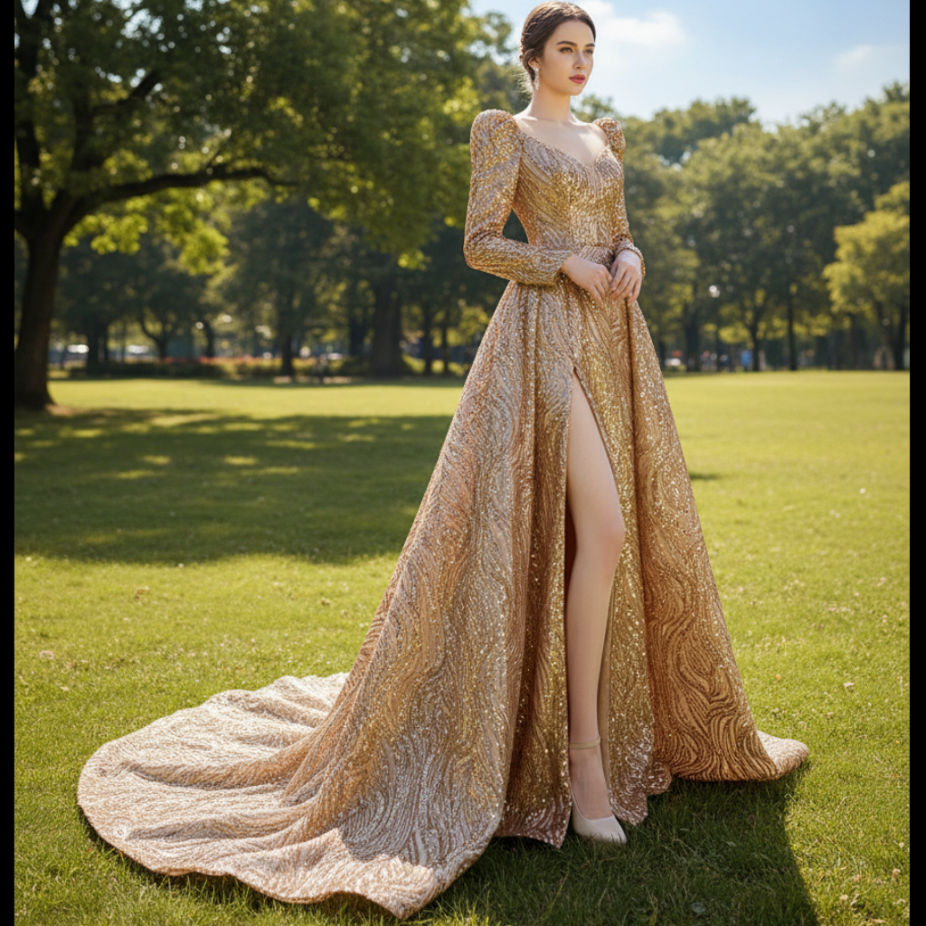 Robe de soirée de luxe sirène dorée, manches longues, fente sur les jambes