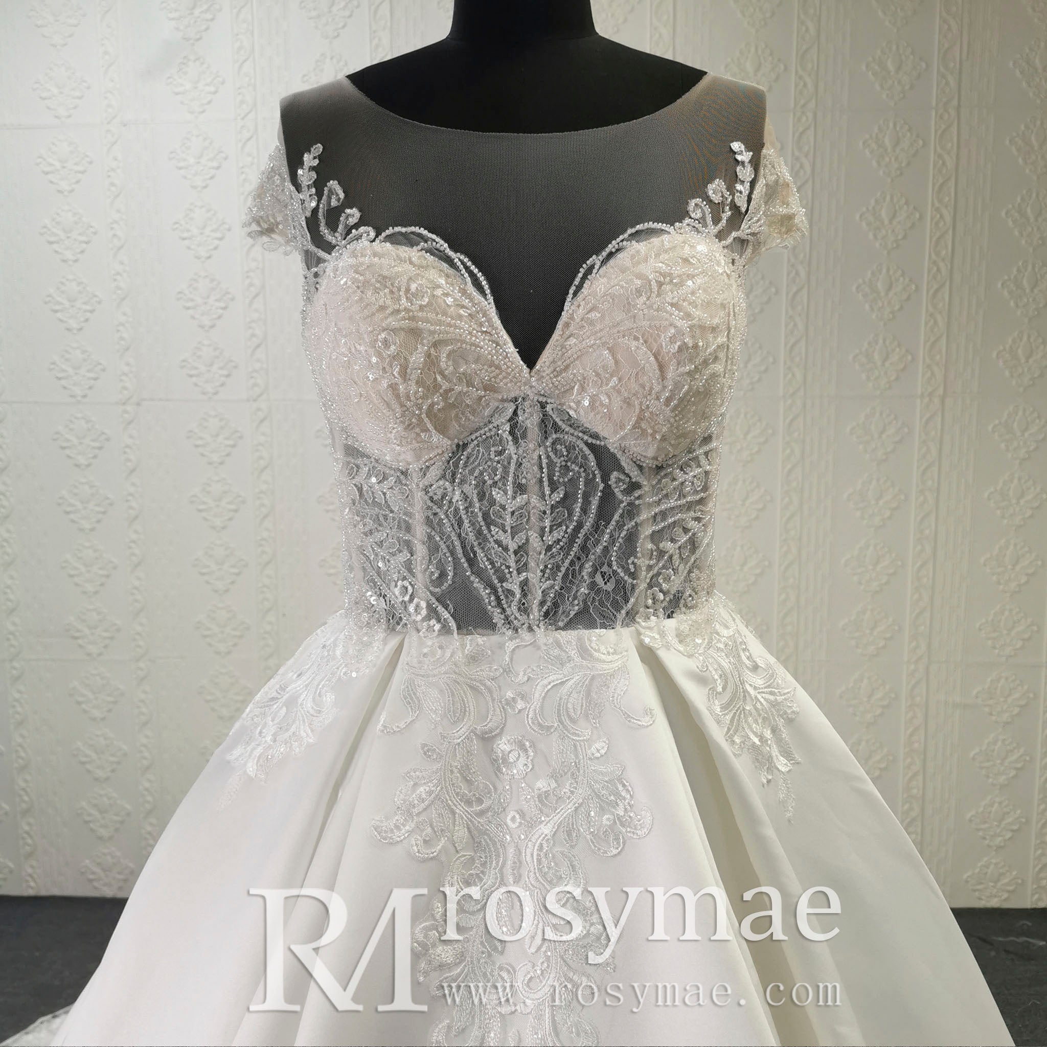 Robes de mariée en satin à manches courtes avec corsage transparent et dentelle