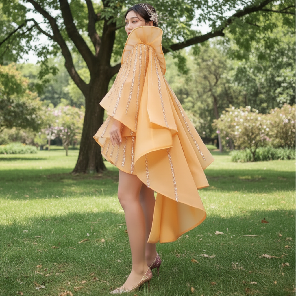 Préparez-vous à scintiller et briller avec cette robe de graduation ! Cette magnifique robe de bal midi présente un design à une épaule avec un volant séduisant et une superbe couleur champagne or. La longueur mini ajoute une touche d'élégance ludique. Démarquez-vous lors de votre journée spéciale avec cette robe scintillante et accrocheuse !