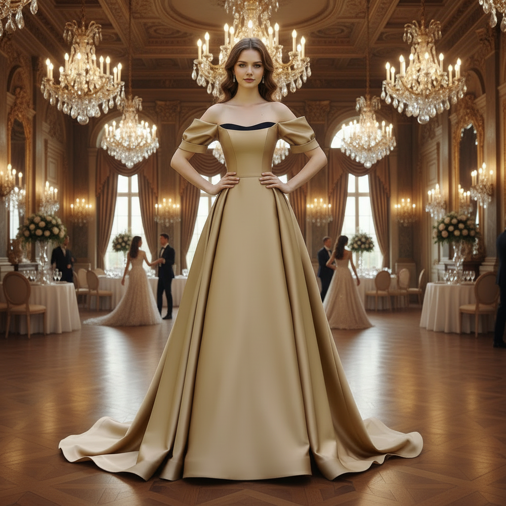 Robe de bal en satin café à manches courtes et épaules dénudées