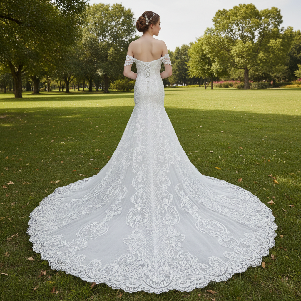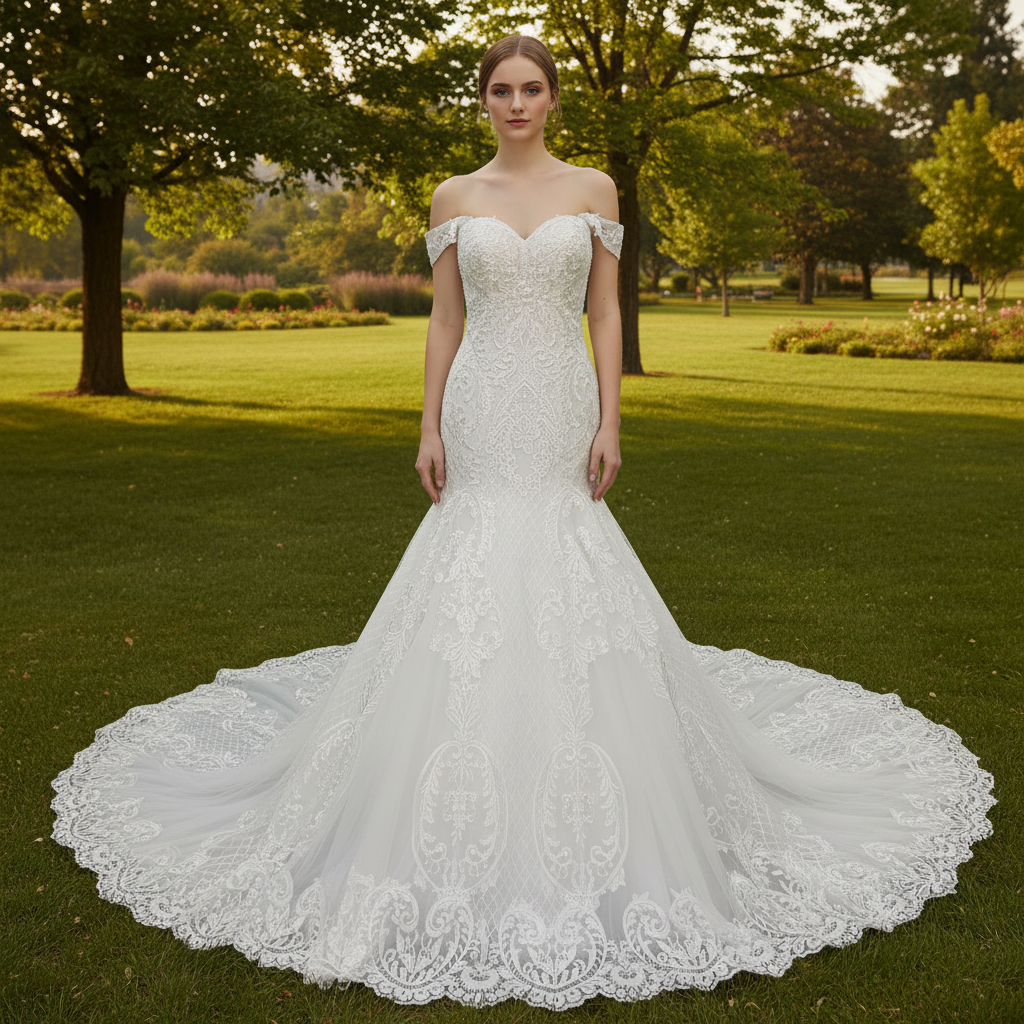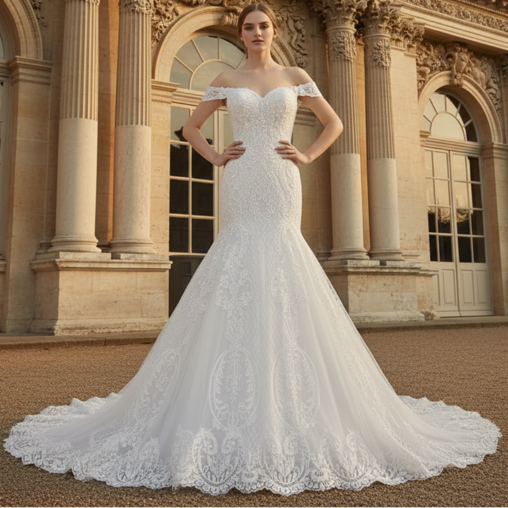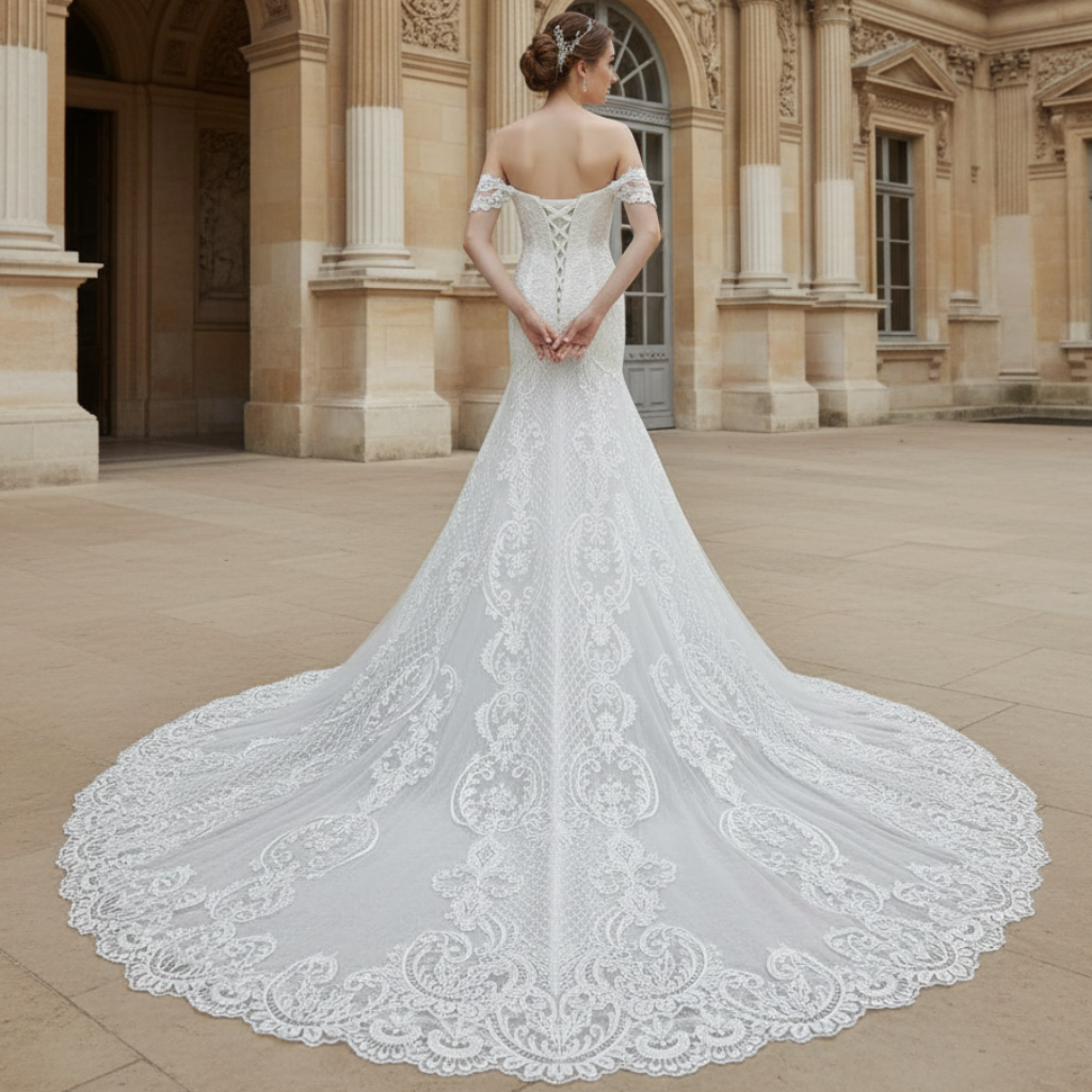 Cette élégante robe de mariée en dentelle, à épaules dénudées et coupe trompette, est conçue pour rendre votre mariage inoubliable. Sa traîne cathédrale à couper le souffle ajoute une touche de romantisme et de glamour à votre entrée dans l'allée, créant un effet spectaculaire qui captivera tous les regards. Le décolleté en cœur flatteur met en valeur vos épaules et votre décolleté, alliant une élégance intemporelle à une modernité affirmée. De délicates dentelles ornent la silhouette trompette, qui épouse vos formes du buste jusqu'au-dessous du genou avant de s'évaser, sublimant vos courbes naturelles avec grâce et sophistication. Les fines applications de dentelle ajoutent profondeur et texture, créant une ambiance romantique et intemporelle qui s'accorde avec tous les thèmes de mariage. Parfaite pour la mariée qui souhaite allier charme classique et style contemporain, cette robe garantit un confort optimal sans compromis sur l'élégance. Sa coupe parfaitement ajustée vous confère confiance et assurance, vous permettant de rayonner de l'entrée dans l'allée jusqu'à la fin des festivités. Rendez votre mariage extraordinaire grâce à cette robe exquise qui incarne le romantisme, l'élégance et un savoir-faire raffiné.