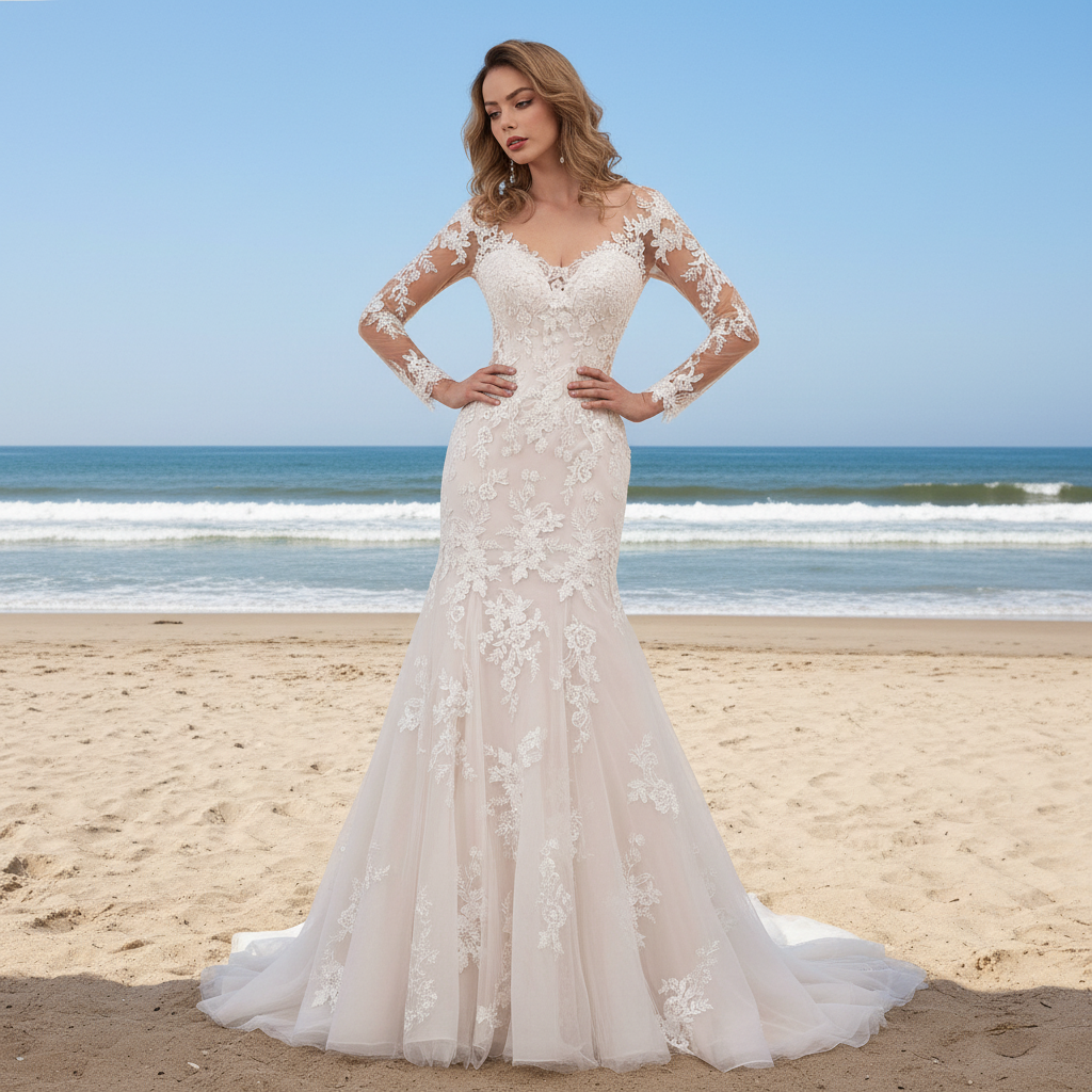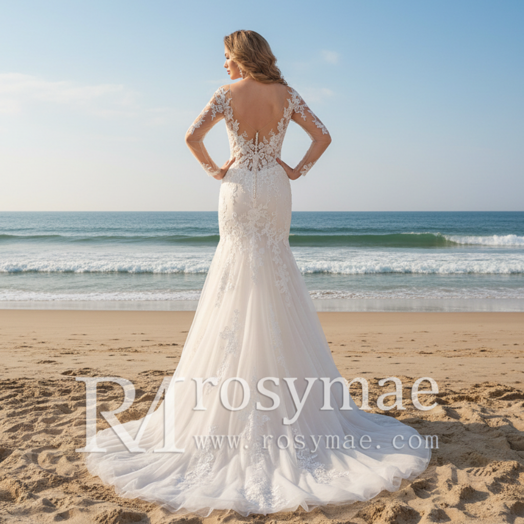 Robe de mariée à manches longues transparentes et illusion avec tulle nude et lacets flottants, col en V, léger chatoiement sur tout le design sirène qui fait écho au luxe moderne, le dos large ouvert est également bordé de détails en dentelle flottante pour une traîne fraîche et parfaite. votre moment de mariage.