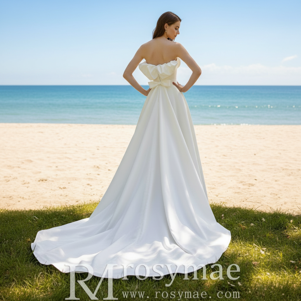 Cette robe de mariée faite à la main présente un décolleté à volants romantique et une élégante silhouette trapèze. L'encolure dégagée ajoute une touche de féminité tandis que la traîne chapelle ajoute une touche classique. Dotée d'un charmant nœud papillon sur le devant, cette robe est parfaite pour un look de mariée intemporel et sophistiqué.