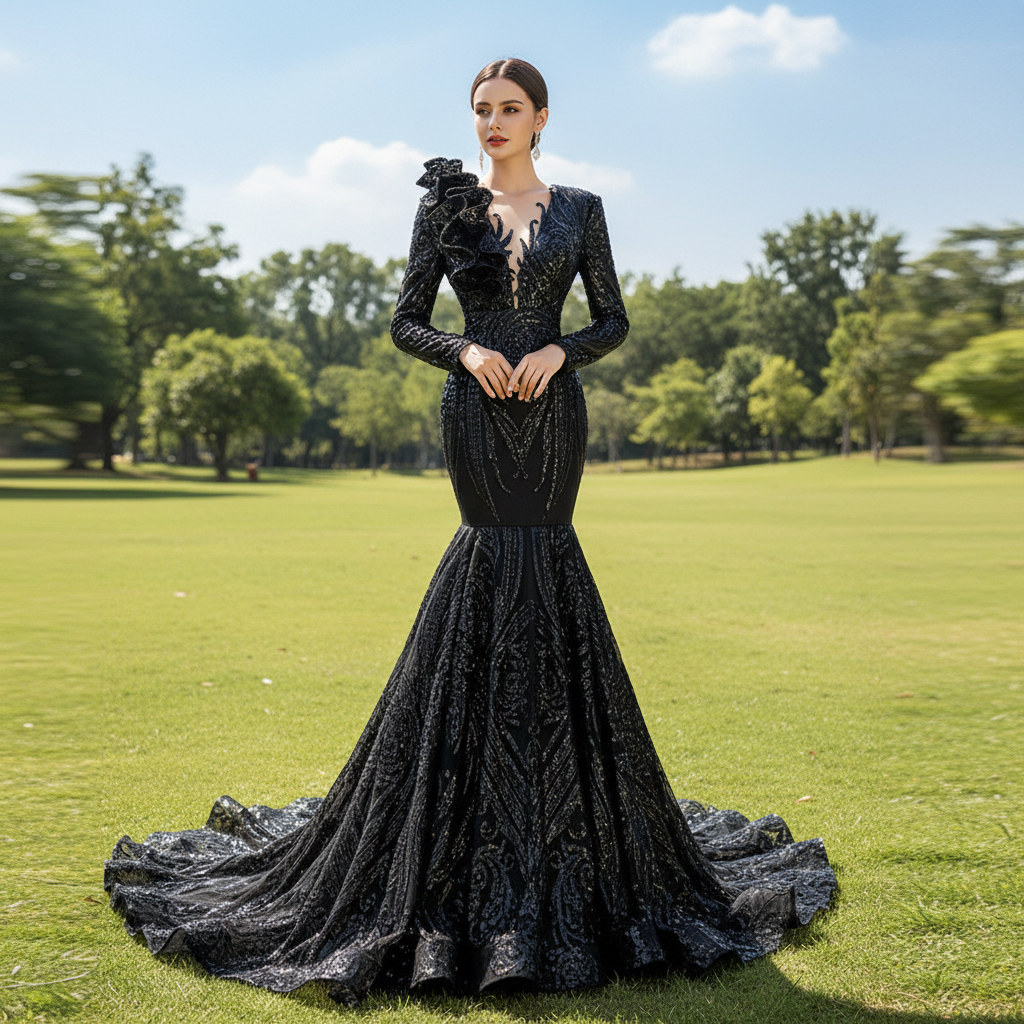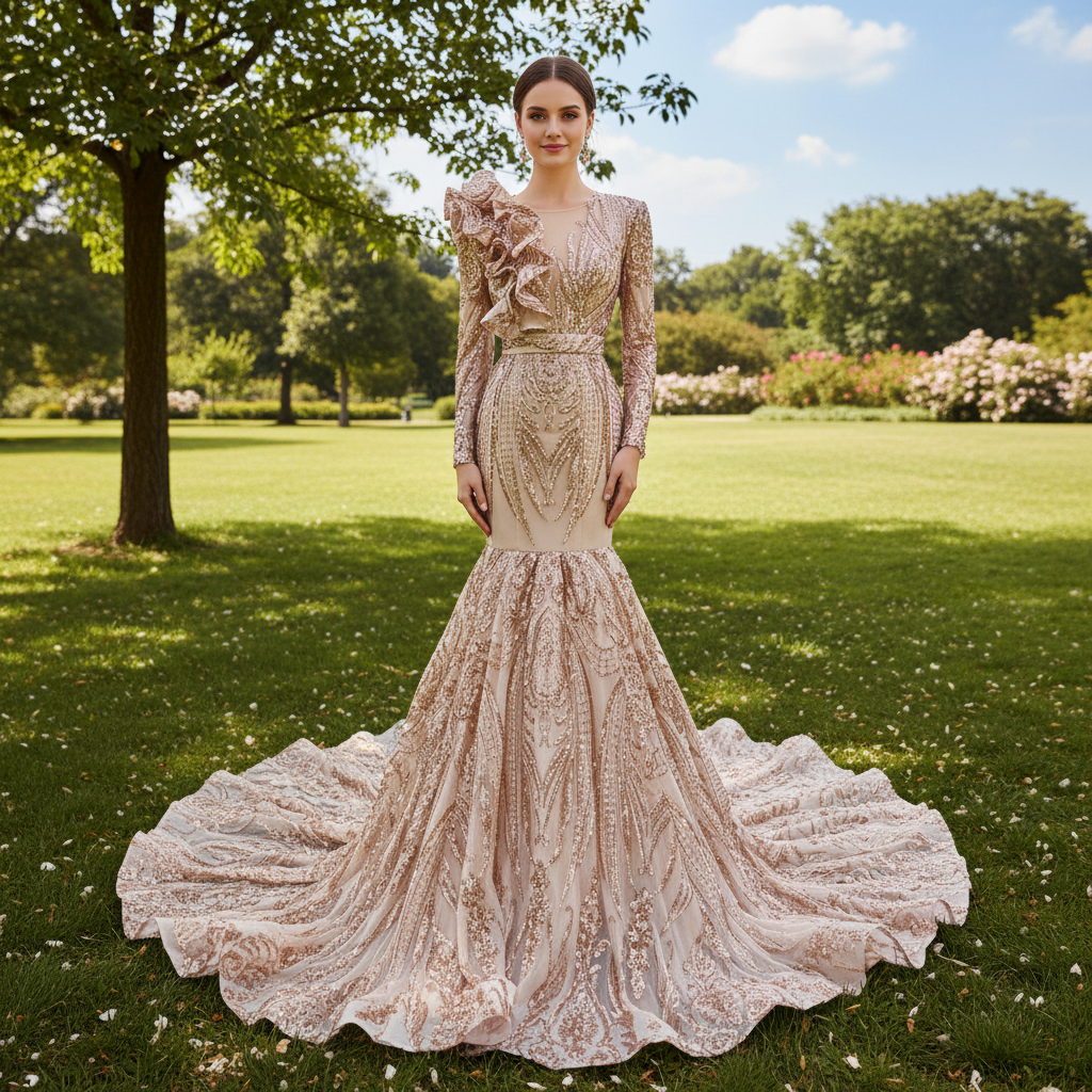 Robe de bal sirène à manches longues et paillettes uniques scintillantes