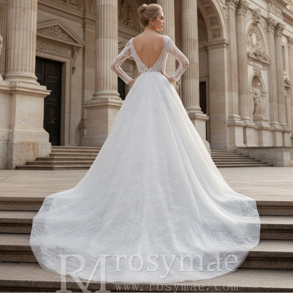 Conçue pour la mariée rêvant d'un conte de fées, cette somptueuse robe de bal allie sophistication classique et glamour moderne. Les manches longues offrent une élégante couvrance tandis que le corsage semi-transparent dévoile de délicates broderies de perles et des applications de dentelle qui captent magnifiquement la lumière tout au long de la cérémonie. La jupe volumineuse crée une silhouette spectaculaire, sublimée en photo, tandis que la traîne de longueur chapelle est ornée de détails en dentelle vaporeuse qui ajoutent mouvement et romantisme à chaque pas. Cette robe marie avec élégance ornementation et confection raffinée, ce qui en fait un choix idéal pour les cérémonies formelles et les lieux prestigieux. La combinaison d'un corsage structuré et d'une traîne fluide assure confort et allure spectaculaire pour votre entrée dans l'église.