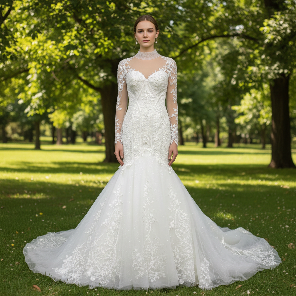 Cette robe de mariée époustouflante présente un corsage transparent à l'encolure ronde flatteuse et au décolleté en cœur. Avec ses manches longues et sa coupe sirène, elle allie à la perfection élégance et charme. Soyez la star de votre mariage grâce à cette robe à couper le souffle.