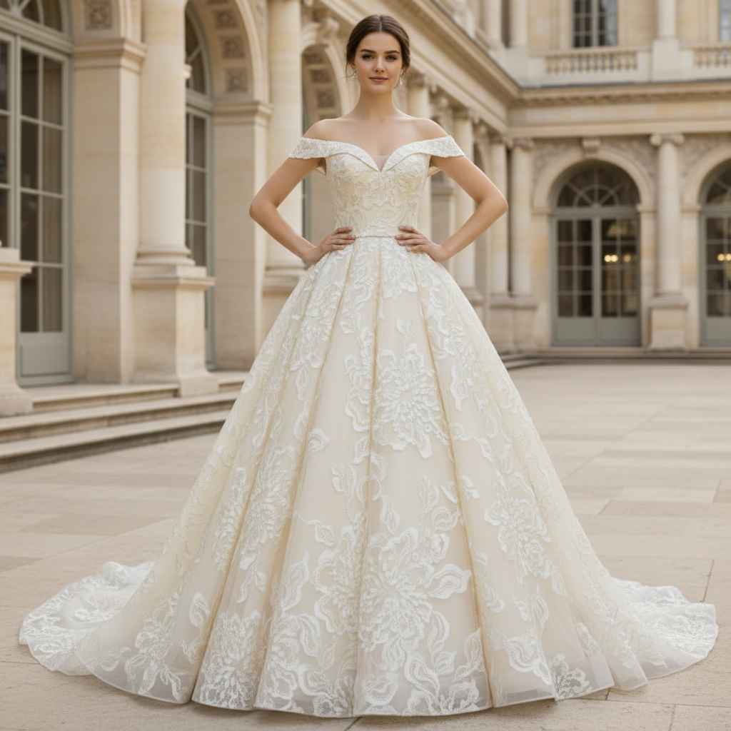 Préparez-vous à épater votre journée spéciale avec notre robe de mariée champagne à épaules dénudées, élégante et séduisante ! Dotée d'un col en V flatteur, d'une dentelle florale délicate et d'une superbe traîne cathédrale, cette robe vous fera sentir comme une vraie mariée. Dites « oui » avec style et confort avec notre robe de mariée champagne !