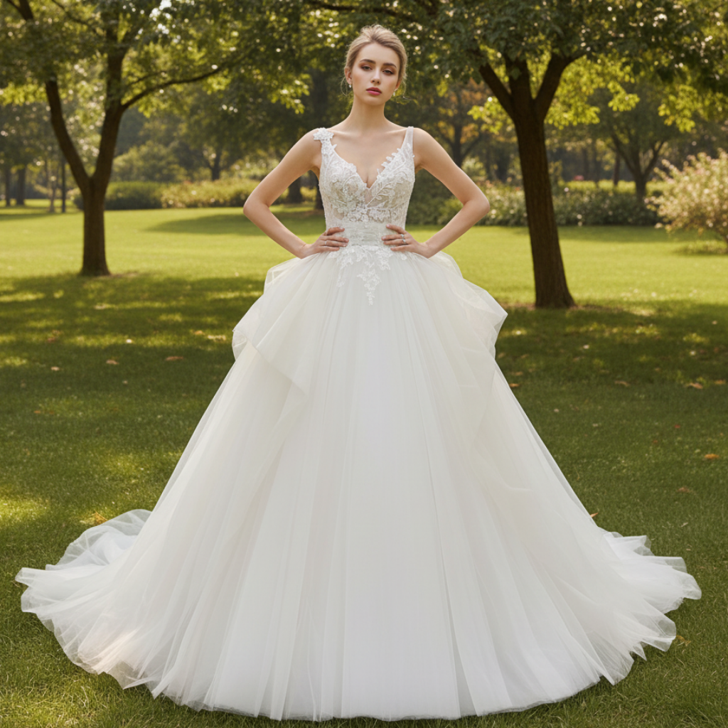 Robe de mariée en tulle avec décolleté en V et jupe superposée