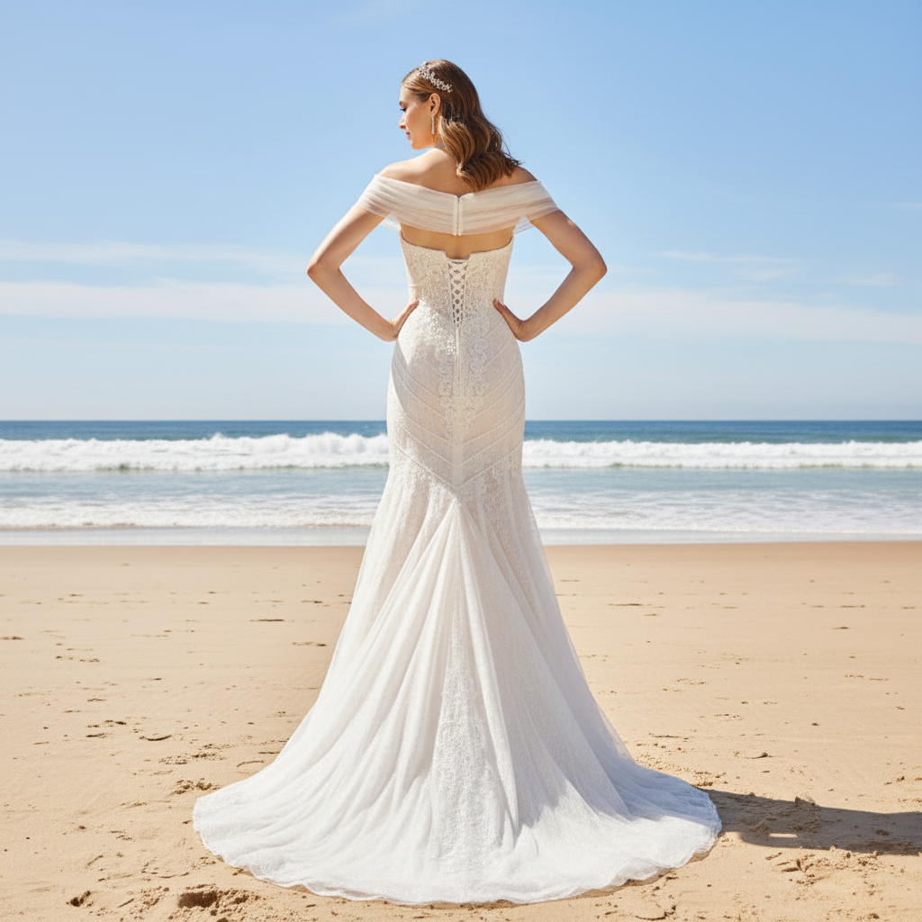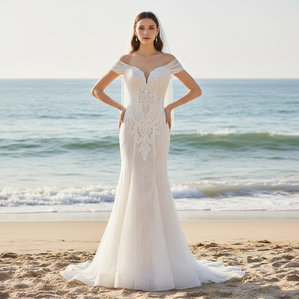 Confectionnée en tulle délicat et dotée d'une jupe transparente, notre robe de mariée sirène à épaules dénudées respire l'élégance. La coupe ajustée et évasée accentue la silhouette, tandis que le décolleté en V ajoute une touche de charme. Ornée de cristaux scintillants, c'est un choix époustouflant pour toute mariée.