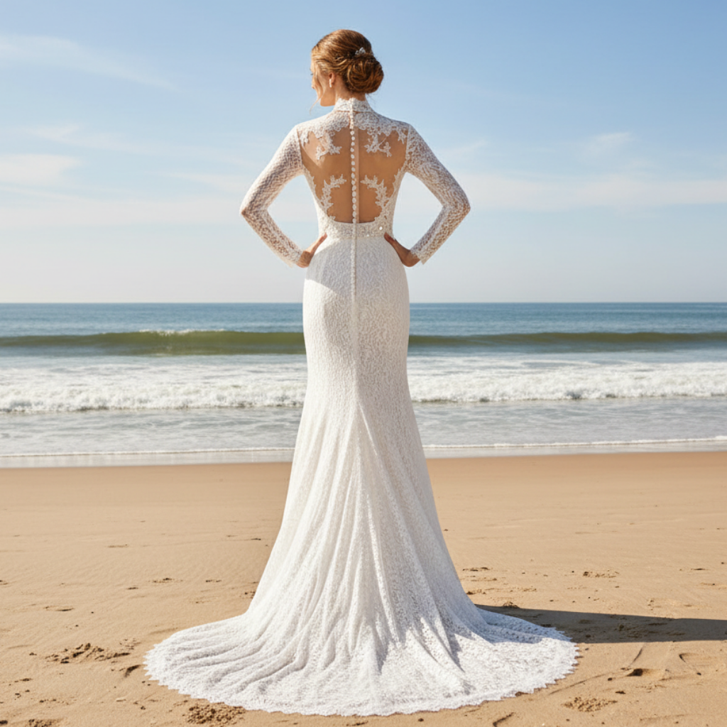 Robe de mariée en dentelle à manches trois-quarts avec encolure tortue