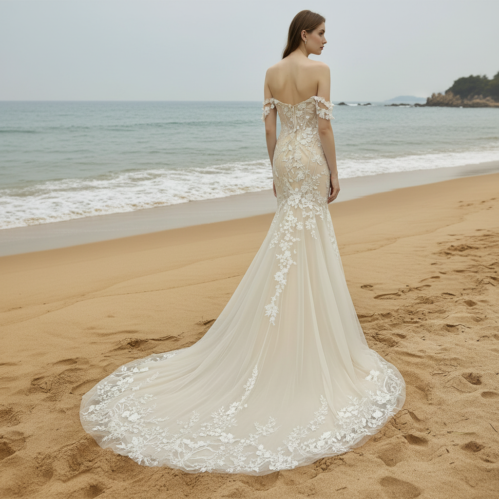 Robe de mariée sirène princesse chérie faite à la main qui épouse et flatte vos courbes, tandis que le décolleté à épaules dénudées ajoute une touche de romantisme. Le dossier bas et la couleur champagne créent un look époustouflant et unique. Marchez dans l'allée avec confiance et grâce dans cette robe exquise avec une traîne chapelle.