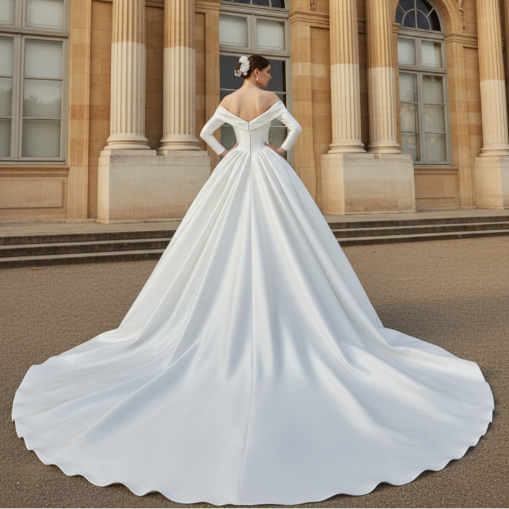 Robes de mariée à manches longues en satin à épaules dénudées Robes de mariée