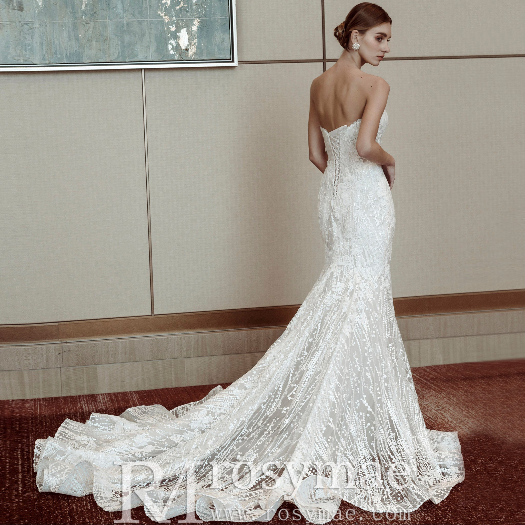 Robe de mariée sirène en dentelle sans bretelles avec décolleté en cœur
